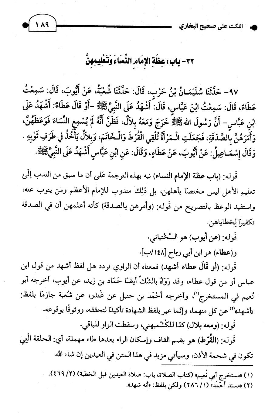 97 - حَدَّثَنَا سُلَيْمَانُ بْنُ حَرْبٍ، قَالَ: حَدَّثَنَا شُعْبَةُ، عَنْ أَيُّوبَ، قَالَ: سَمِعْتُ عَطَاءً، قَالَ: سَمِعْتُ ابْنَ عَباسٍ، قَالَ: أَشْهَدُ عَلَى النَّبِيِّ - صلى الله عليه وسلم -أَوْ قَالَ عَطَاءٌ: أَشْهَدُ عَلَى ابْنِ عَبَّاسٍ- أَنَّ رَسُولَ الله - صلى الله عليه وسلم - خَرَجَ وَمَعَهُ بِلَالٌ، فَظَنَّ أنَّهُ لمْ يُسْمِع النَّسَاءَ فَوَعَظَهُن، وَأَمَرَهُنَّ بِالصَّدَقَةِ، فَجَعَلَتِ الْمَرْأَةُ تلْقِي الْقُرْطَ وَالْخَاتَمَ، وَبِلَالٌ يَأْخُذُ في طَرَفِ ثَوْبِهِ. وَقَالَ إِسْمَاعِيلُ: عَنْ أَيُّوبَ، عَنْ عَطَاءٍ، وَقَالَ: عَنِ ابْنِ عَباسٍ أَشْهَدُ عَلَى النَّبِيِّ - صلى الله عليه وسلم -.