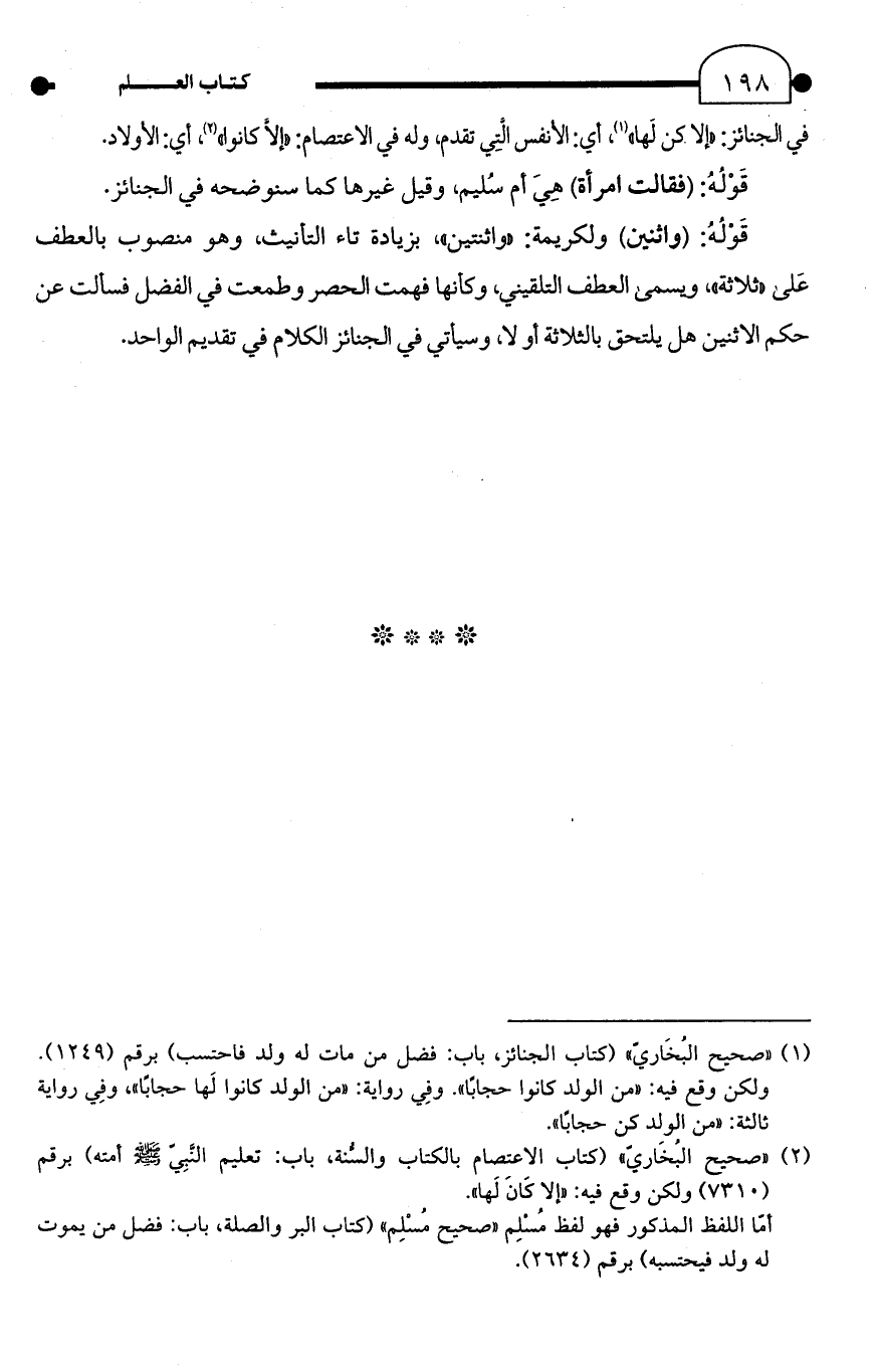 (¬1) "صحيح البُخَاريّ" (كتاب الجنائز، باب: فضل من مات له ولد فاحتسب) برقم (1249). ولكن وقع فيه: "من الولد كانوا حجابًا". وفِي رواية: "من الولد كانوا لَها حجابًا"، وفِي رواية ثالثة: "من الولد كن حجابًا".