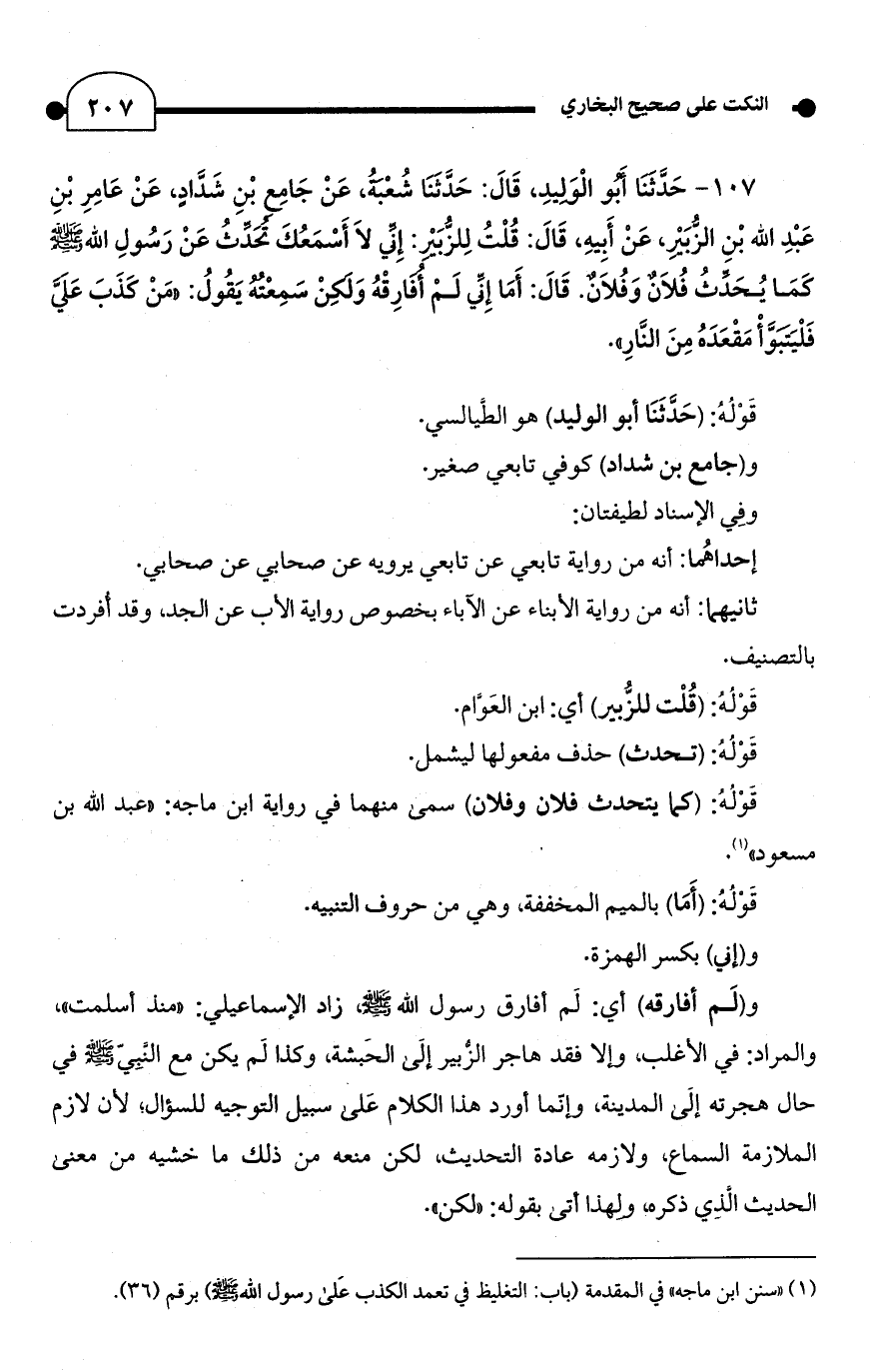 107 - حدَّثَنَا أَبُو الْوَلِيدِ، قَالَ: حدَّثَنَا شُعْبَةُ، عَنْ جَامِعٍ بْنِ شَدَّادٍ، عَنْ عَامِرِ بْنِ عَبْدِ الله بْنِ الزُّبَيْرِ، عَنْ أَبِيهِ، قَالَ: قُلْتُ لِلزُّبَيْر: إِنِّي لَا أَسْمَعُكَ تحَدِّثُ عَنْ رَسُولِ الله - صلى الله عليه وسلم - كَمَا يُحَدِّثُ فُلَانٌ وَفُلَانٌ. قَالَ: أَمَا إِنِّي لَم أُفَارِقْهُ وَلكِنْ سَمِعْتُهُ يَقُوُل: "مَنْ كَذَبَ عَلَيَّ فَلْيَتبَؤَأْ مَقْعَدَهُ مِنَ النَّارِ".