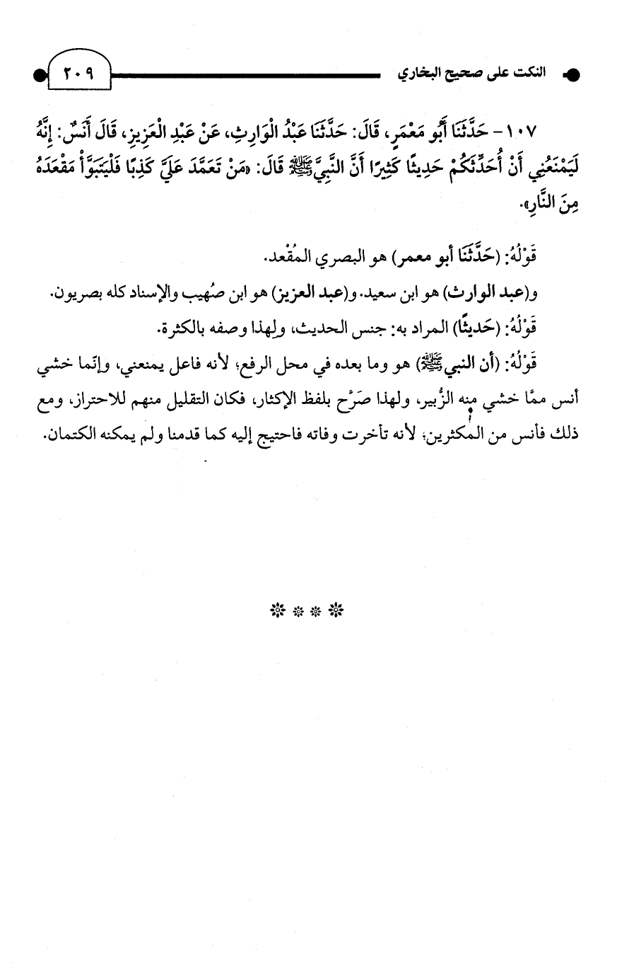 107 - حدَّثَنَا أبُو مَعْمَرٍ، قَالَ: حدَّثَنَا عَبْدُ الْوَارِثِ، عَنْ عَبْدِ الْعَزِيزِ، قَالَ أَنَسٌ: إِنَّهُ لَيَمْنَعُنِي أَنْ أُحدَّثُكُمْ حَدِيثًا كَثِيرًا أَنَّ النَّبِيَّ - صلى الله عليه وسلم - قَالَ: "مَنْ تَعَمَّدَ عَلَيَّ كَذِبًا فَلْيَتَبَوأْ مَقْعَدَهُ مِنَ النَّارِ".
