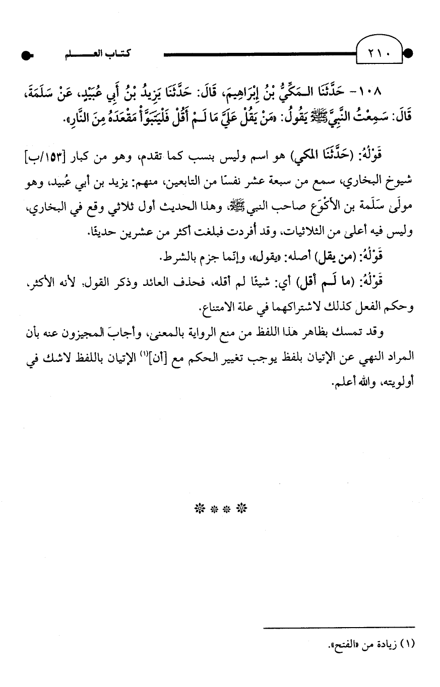 108 - حدَّثَنَا المَكِّيُّ بْنُ إِبْرَاهِيمَ، قَالَ: حَدَّثَنَا يَزِيدُ بْنُ أَبِي عُبَيْدٍ، عَنْ سَلَمَةَ، قَالَ: سَمِعْتُ النَّبِيَّ - صلى الله عليه وسلم - يَقُولُ: "مَنْ يَقُلْ عَليَّ مَا لَم أَقُلْ فَلْيَتَبَوَّأْ مَقْعَدَهُ مِنَ النَّارِ".