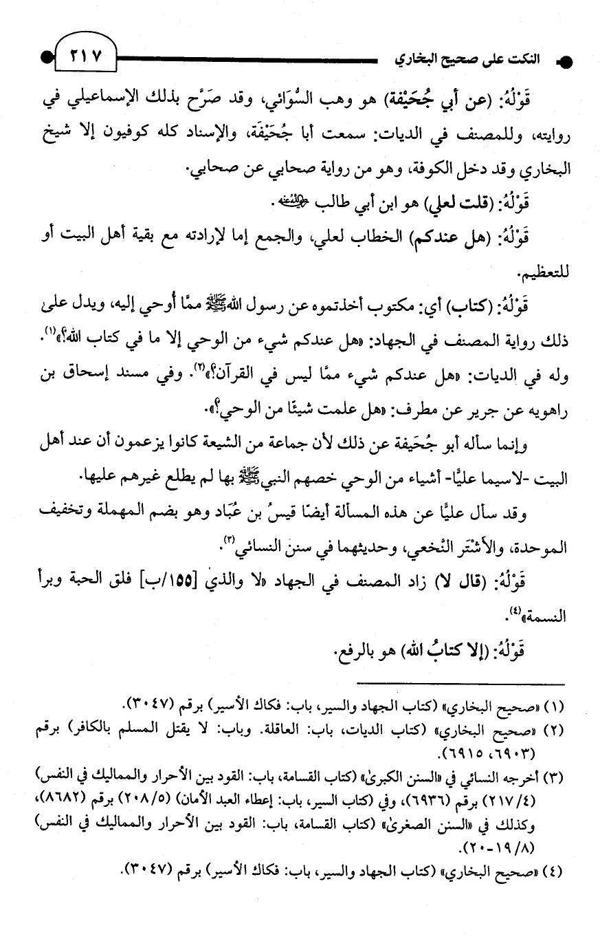 وإنما سأله أبو جُحَيفة عن ذلك لأن جماعة من الشيعة كانوا يزعمون أن عند أهل البيت -لاسيما عليًّا- أشياء من الوحي خصهم النبي - صلى الله عليه وسلم - بها لم يطلع غيرهم عليها.
