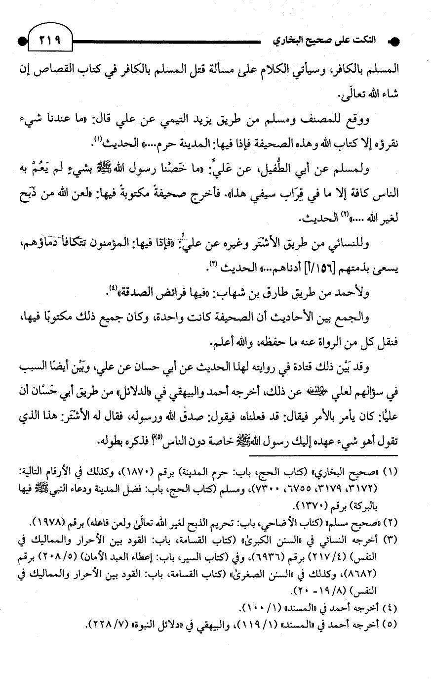 ووقع للمصنف ومسلم من طريق يزيد التيمي عن علي قال: "ما عندنا شيء نقرؤه إلَّا كتاب الله وهذه الصحيفة فإذا فيها: المدينة حرم. . . ." الحديث (¬1).