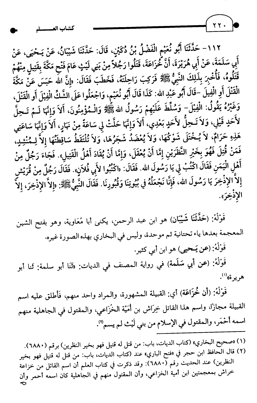 112 - حدَّثَنَا أَبُو نُعَيْمٍ الْفَضْلُ بْنُ دُكَيْنٍ، قَالَ: حَدَّثَنَا شَيْبَانُ، عَنْ يَحْيىَ، عَنْ أَبي سَلَمَةَ، عَنْ أَبِي هُرَيْرَةَ، أَنَّ خُزَاعَةَ، قَتَلُوا رَجُلًا مِنْ بَني لَيْثٍ عَامَ فَتْحِ مَكَّةَ بِقَتِيلٍ مِنْهُمْ قَتَلُوهُ، فَأُخْبِرَ بِذَلِكَ النَّبِيُّ - صلى الله عليه وسلم - فَرَكِبَ رَاحِلته، فَخَطَبَ فَقَالَ: "إِنَّ الله حَبَسَ عَنْ مَكَّةَ الْقَتْلَ أَوِ الْفِيلَ -قَالَ أَبُو عَبْدِ الله: كَذَا قَالَ أَبُو نُعَيْمٍ، وَاجْعَلُوا عَلَى الشَكِّ الْفِيْلَ أَو الْقَتْلَ، وَغَيْرُهُ يَقُولُ: الْفِيْلَ- وَسُلِّطَ عَلَيْهِمْ رَسُولُ الله - صلى الله عليه وسلم - وَالْمُؤْمِنُونَ، أَلَا وَإِنَّهَا لَمْ تَحِلَّ لأَحَدٍ قَبْلِي، وَلَا تَحِلُّ لأَحَدٍ بَعْدِي، أَلَا وَإِنَّهَا حَلَّتْ لِي سَاعَةً مِنْ نَهَارٍ، أَلَا وَإِنَّهَا سَاعَتِي هَذِهِ حَرَامٌ، لَا يُخْتَلَى شَوْكُهَا، وَلَا يُعْضَدُ شَجَرُهَا، وَلَا تُلْتَقَطُ سَاقِطَتُهَا إِلَّا لِمُنْشِدٍ، فَمَنْ قُتِلَ فَهُوَ بِخَيْرِ النَّظَرَيْنِ إِمَّا أَنْ يُعْقَلَ، وَإِمَّا أَنْ يُقَادَ أَهْلُ الْقَتِيلِ". فَجَاءَ رَجُل مِنْ أَهْلِ الْيَمَنِ فَقَالَ اكْتُبْ لِي يَا رَسُولَ الله. فَقَالَ: "اكْتبوا لأَبِي فُلَانٍ". فَقَالَ رَجُلٌ مِنْ قُرَيْشٍ إِلَّا الإِذْخِرَ يَا رَسُولَ الله، فَإِنَّا نَجْعَلُهُ في بُيُوتِنَا وَقُبُورِنَا. فَقَالَ النَّبِيُّ - صلى الله عليه وسلم -: "إِلَّا الإذْخِرَ، إِلَّا الإِذْخِرَ".