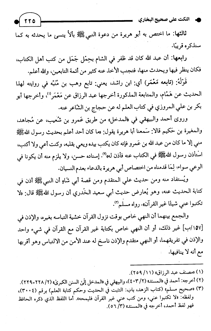 (¬3) "صحيح مسلم" (كتاب الزهد، باب: التثبت في الحديث وحكم كتابة العلم) برقم (3004)، ولفظه: "لا تكتبوا عني، ومن كتب عني غير القرآن فليمحه". أما اللفظ الذي ذكره الحافظ فهو لفظ أحمد، أخرجه في "المسند" (3/ 56).