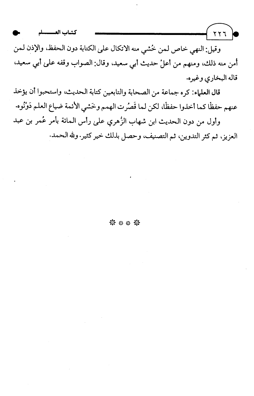 قال العلماء: كره جماعة من الصحابة والتابعين كتابة الحديث، واستحبوا أن يؤخذ عنهم حفظًا كما أخذوا حفظًا، لكن لما قَصُرت الهمم وخَشي الأئمة ضياع العلم دَوَّنُوه.