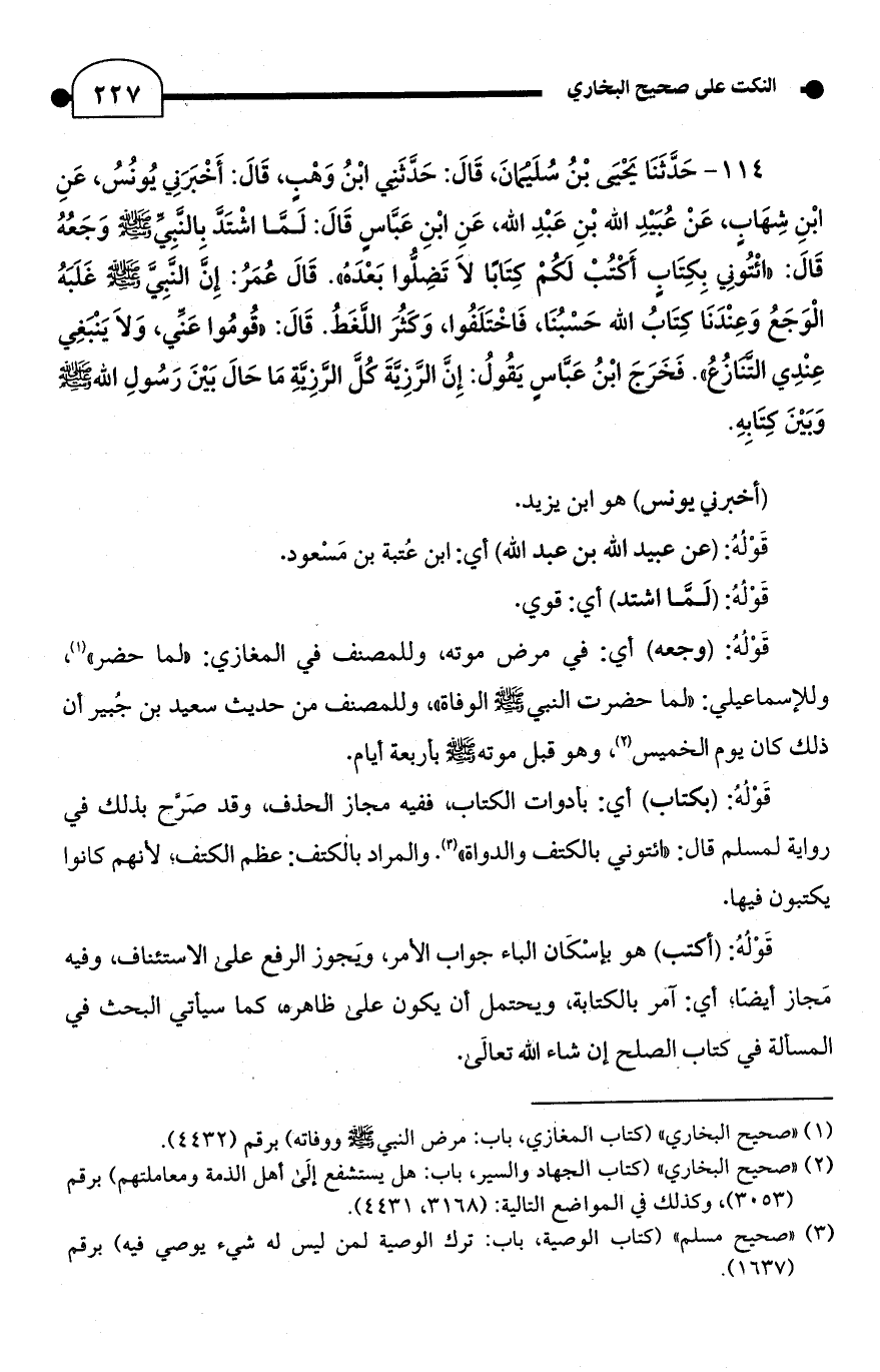 114 - حَدَّثَنَا يَحْيَى بْنُ سُلَيْمَانَ، قَالَ: حَدَّثَنِي ابْنُ وَهْبٍ، قَالَ: أَخْبَرَنِي يُونُسُ، عَنِ ابْنِ شِهَابٍ، عَنْ عُبَيْدِ الله بْنِ عَبْدِ الله، عَنِ ابْنِ عَبَّاسٍ قَالَ: لَمَّا اشْتَدَّ بالنَّبِيِّ - صلى الله عليه وسلم - وَجَعُهُ قَالَ: "ائْتُونِي بِكِتَابٍ أَكتُبْ لَكُمْ كِتَابًا لَا تَضِلُّوا بَعْدَهُ". قَالَ عُمَرُ: إِنَّ النَّبِيَّ - صلى الله عليه وسلم - غَلَبَهُ الْوَجَعُ وَعِنْدَنَا كِتَابُ الله حَسْبُنَا، فَاخْتَلَفُوا، وَكَثُرَ اللَّغَطُ. قَالَ: "قُومُوا عَنِّي، وَلَا يَنْبَغِي عِنْدِي التَّنَازُعُ". فَخَرَجَ ابْنُ عَبَّاسٍ يَقُولُ: إِنَّ الرَّزِيَّةَ كُلَّ الرَّزِيَّةِ مَا حَالَ بَيْنَ رَسُولِ الله - صلى الله عليه وسلم - وَبَيْنَ كِتَابِهِ.