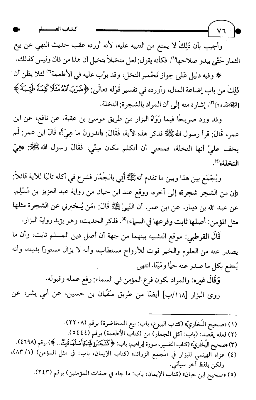 وقد ورد صريحا فيما رَوَاهُ البزار من طريق موسى بن عقبة، عن نافع، عن ابن عمر، قالَ قرأ رسول الله - صلى الله عليه وسلم - فذكر هذه الآية، فَقَالَ: "أتدرونَ ما هِيَ؟ " قَالَ ابن عمر: لَم يخف عليَّ أنها النخلة، فمنعني أن أتكلم مكان سِني، فَقَالَ رسول الله - صلى الله عليه وسلم -: "هِيَ النخلة" (¬4).