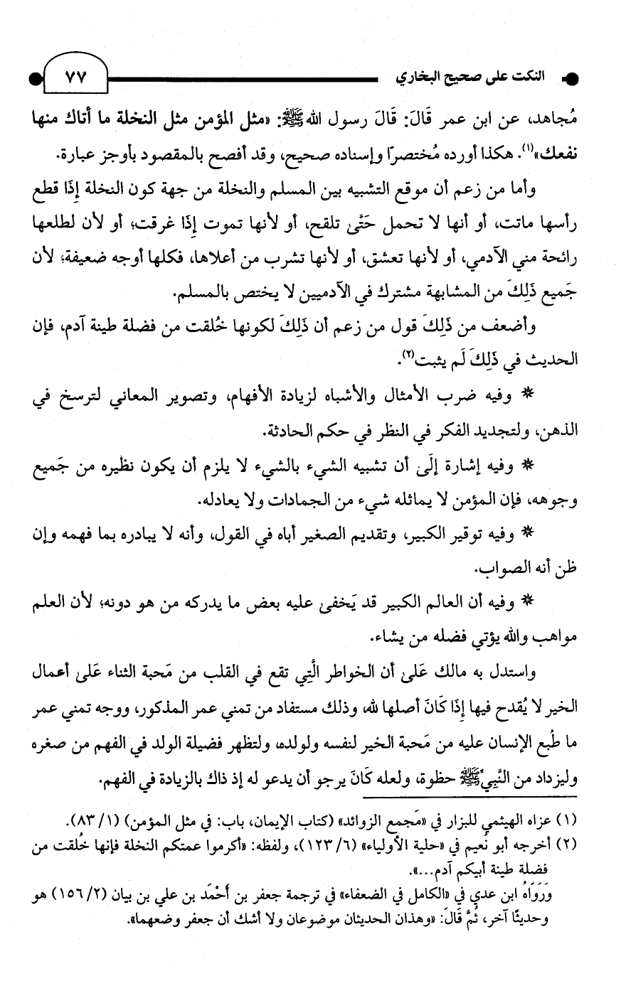 مُجاهد، عن ابن عمر قَالَ: قَالَ رسول الله - صلى الله عليه وسلم -: "مثل المؤمن مثل النخلة ما أتاك منها نفعك" (¬1). هكذا أورده مُختصرا وإسناده صحيح، وقد أفصح بالمقصود بأوجز عبارة.