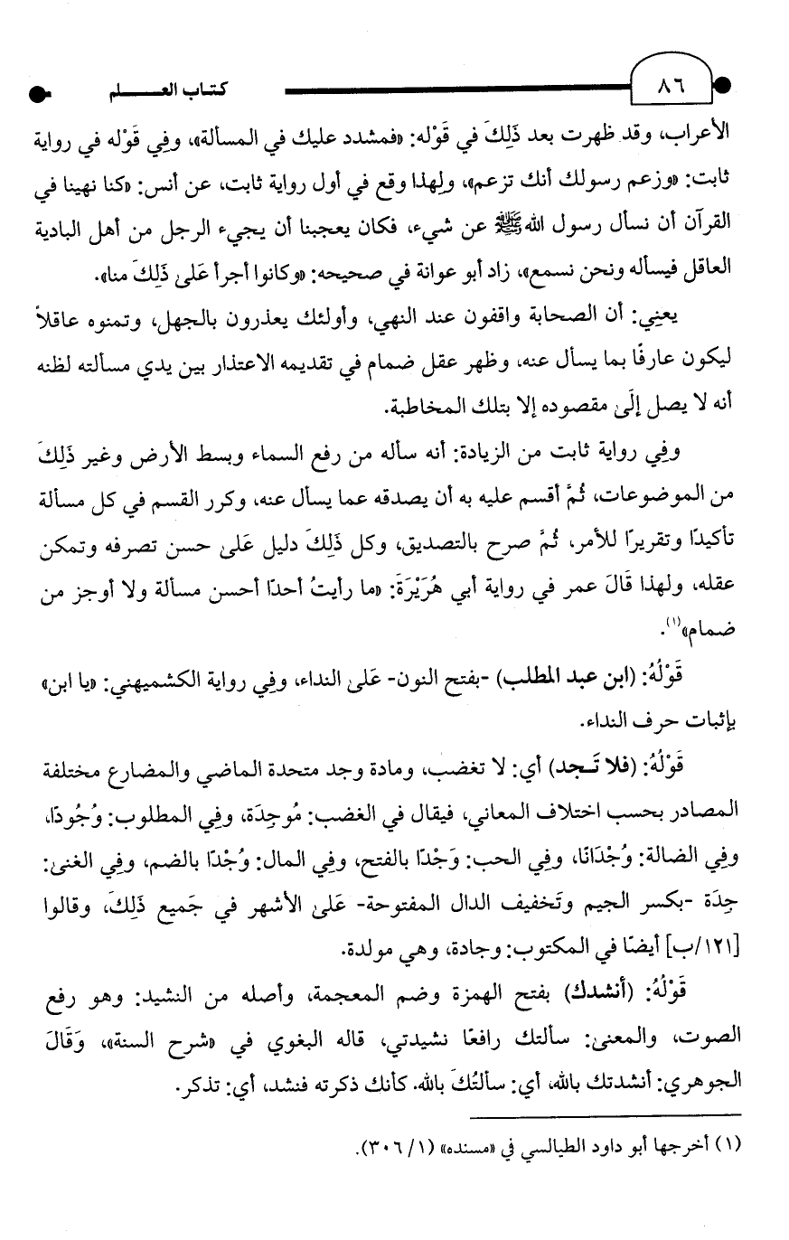 الأعراب، وقد ظهرت بعد ذَلِكَ في قَوْله: "فمشدد عليك في المسألة"، وفِي قَوْله في رواية ثابت: "وزعم رسولك أنك تزعم"، ولهذا وقع في أول رواية ثابت، عن أنس: "كنا نهينا في القرآن أن نسأل رسول الله - صلى الله عليه وسلم - عن شيء، فكان يعجبنا أن يجيء الرجل من أهل البادية العاقل فيسأله ونحن نسمع"، زاد أبو عوانة في صحيحه: "وكانوا أجرأ عَلى ذَلِكَ منا".