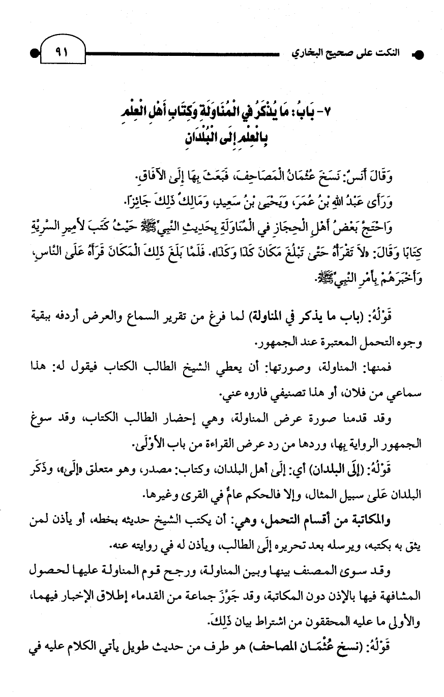 7 - بَابُ: مَا يُذْكَرُ في الْمُنَاوَلَةِ وَكِتَابِ أَهْلِ الْعِلْمِ بالْعِلْمِ إِلى الْبُلْدَانِ