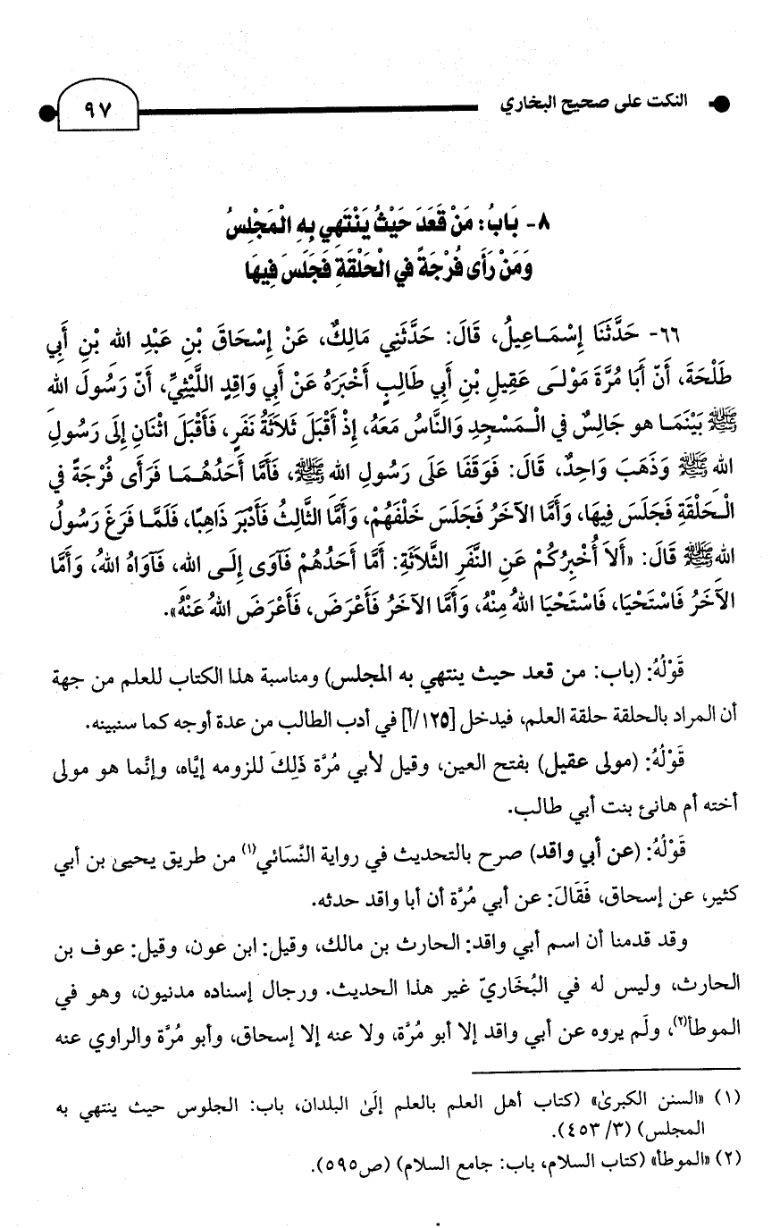 (¬1) "السنن الكبرى" (كتاب أهل العلم بالعلم إلَى البلدان، باب: الجلوس حيث ينتهي به المجلس) (3/ 453).