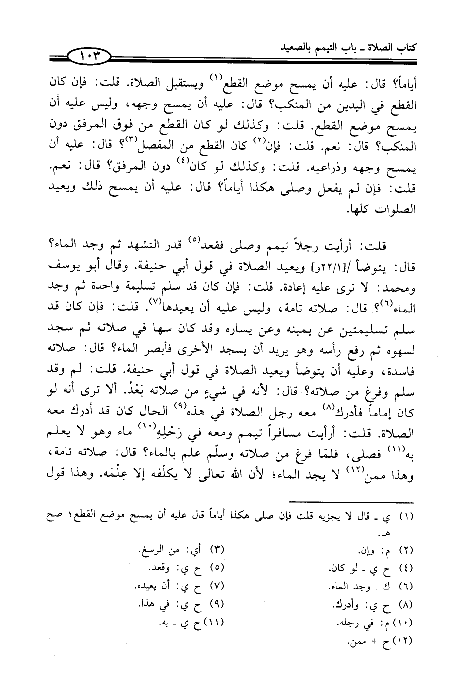 قلت: أرأيت رجلاً تيمم وصلى فقعد (¬5) قدر التشهد ثم وجد الماء؟ قال: يتوضأ ويعيد الصلاة في قول أبي حنيفة. وقال أبو يوسف ومحمد: لا نرى عليه إعادة. قلت: فإن كان قد سلم تسليمة واحدة ثم وجد الماء (¬6)؟ قال: صلاته تامة، وليس عليه أن يعيدها (¬7). قلت: فإن كان قد سلم تسليمتين عن يمينه وعن يساره وقد كان سها في صلاته ثم سجد لسهوه ثم رفع رأسه وهو يريد أن يسجد الأخرى فأبصر الماء؟ قال: صلاته فاسدة، وعليه أن يتوضأ ويعيد الصلاة في قول أبي حنيفة. قلت: لم وقد سلم وفرغ من صلاته؟ قال: لأنه في شيء من صلاته بَعْدُ. ألا ترى أنه لو كان إماماً فأدرك (¬8) معه رجل الصلاة في هذه (¬9) الحال كان قد أدرك معه الصلاة. قلت: أرأيت مسافراً تيمم ومعه في رَحْلِهِ (¬10) ماء وهو لا يعلم به (¬11) فصلى، فلمّا فرغ من صلاته وسلّم علم بالماء؟ قال: صلاته تامة، وهذا ممن (¬12) لا يجد الماء؛ لأن الله تعالى لا يكلّفه إلا عِلْمَه. وهذا قول