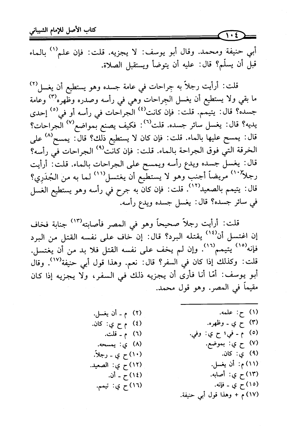 قلت: أرأيت رجلاً به جِراحات في عامة جسده وهو يستطيع أن يغسل (¬2) ما بقي ولا يستطيع أن يغسل الجِراحات وهي في رأسه وصدره وظهره (¬3) وعامة جسده؟ قال: يتيمم. قلت: فإن كانت (¬4) الجراحات في رأسه أو في (¬5) إحدى يديه؟ قال: يغسل سائر جسده. قلت (¬6): فكيف يصنع بمواضع (¬7) الجراحات؟ قال: يمسح عليها بالماء. قلت: فإن كان لا يستطيع ذلك؟ قال: يمسح (¬8) على الخرقة التي فوق الجراحة بالماء. قلت: فإن كانت (¬9) الجراحات في رأسه؟ قال: يغسل جسده ويدع رأسه ويمسح على الجراحات بالماء. قلت: أرأيت رجلاً (¬10) مريضاً أجنب وهو لا يستطيع أن يغتسل (¬11) لما به من الجُدَرِي؟ قال: يتيمم بالصعيد (¬12). قلت: فإن كان به جرح في رأسه وهو يستطيع الغسل في سائر جسده؟ قال: يغسل جسده ويدع رأسه.