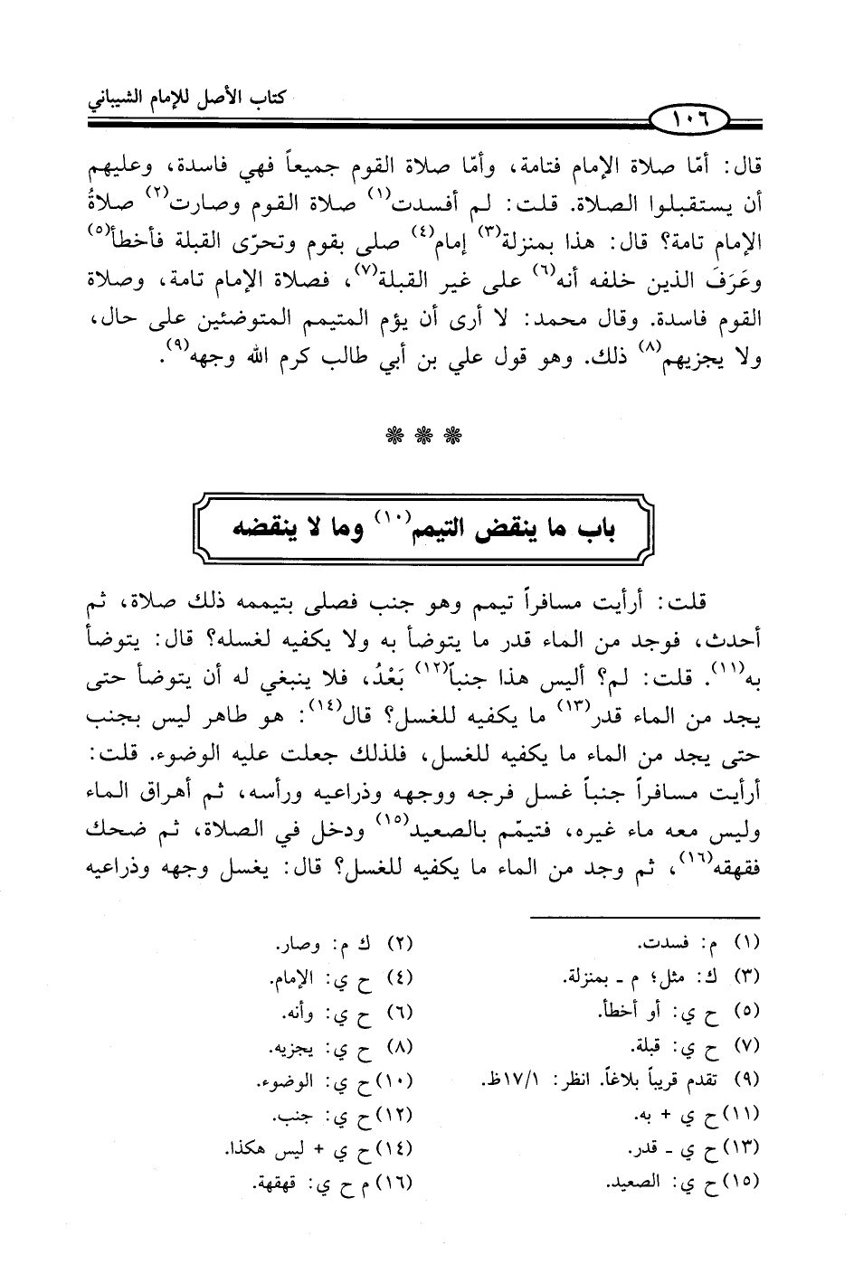 قال: أمّا صلاة الإمام فتامة، وأمّا صلاة القوم جميعاً فهي فاسدة، وعليهم أن يستقبلوا الصلاة. قلت: لم أفسدت (¬1) صلاة القوم وصارت (¬2) صلاةُ الإمام تامة؟ قال: هذا بمنزلة (¬3) إمام (¬4) صلى بقوم وتحرّى القبلة فأخطأ (¬5) وعَرَفَ الذين خلفه أنه (¬6) على غير القبلة (¬7)، فصلاة الإمام تامة، وصلاة القوم فاسدة. وقال محمد: لا أرى أن يؤم المتيمم المتوضئين على حال، ولا يجزيهم (¬8) ذلك. وهو قول علي بن أبي طالب كرم الله وجهه (¬9).