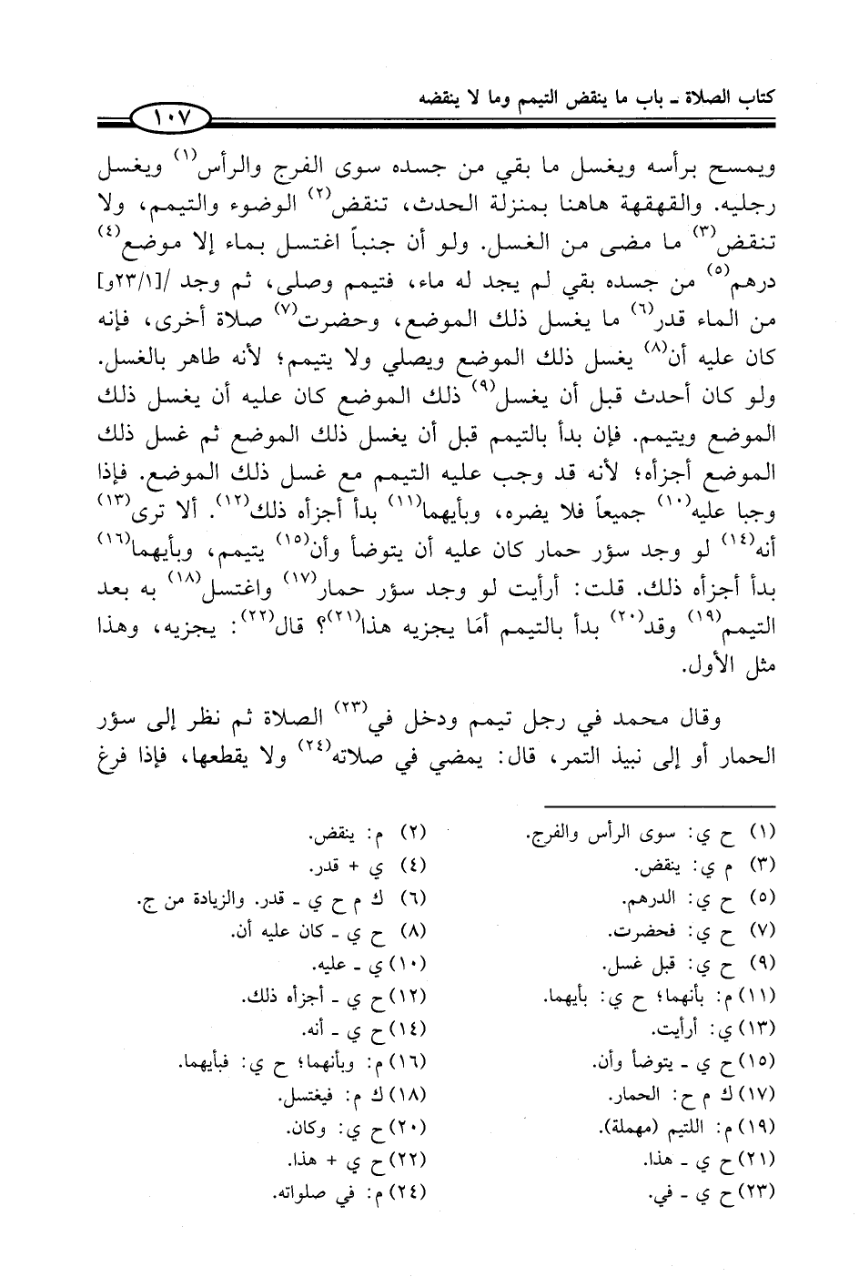 ويمسح برأسه ويغسل ما بقي من جسده سوى الفرج والرأس (¬1) ويغسل رجليه. والقهقهة هاهنا بمنزلة الحدث، تنقض (¬2) الوضوء والتيمم، ولا تنقض (¬3) ما مضى من الغسل. ولو أن جنباً اغتسل بماء إلا موضع (¬4) درهم (¬5) من جسده بقي لم يجد له ماء، فتيمم وصلى، ثم وجد من الماء قدر (¬6) ما يغسل ذلك الموضع، وحضرت (¬7) صلاة أخرى، فإنه كان عليه أن (¬8) يغسل ذلك الموضع ويصلي ولا يتيمم؛ لأنه طاهر بالغسل. ولو كان أحدث قبل أن يغسل (¬9) ذلك الموضع كان عليه أن يغسل ذلك الموضع ويتيمم. فإن بدأ بالتيمم قبل أن يغسل ذلك الموضع ثم غسل ذلك الموضع أجزأه؛ لأنه قد وجب عليه التيمم مع غسل ذلك الموضع. فإذا وجبا عليه (¬10) جميعاً فلا يضره، وبأيهما (¬11) بدأ أجزأه ذلك (¬12). ألا ترى (¬13) أنه (¬14) لو وجد سؤر حمار كان عليه أن يتوضأ وأن (¬15) يتيمم، وبأيهما (¬16) بدأ أجزأه ذلك. قلت: أرأيت لو وجد سؤر حمار (¬17) واغتسل (¬18) به بعد التيمم (¬19) وقد (¬20) بدأ بالتيمم أمَا يجزيه هذا (¬21)؟ قال (¬22): يجزيه، وهذا مثل الأول.