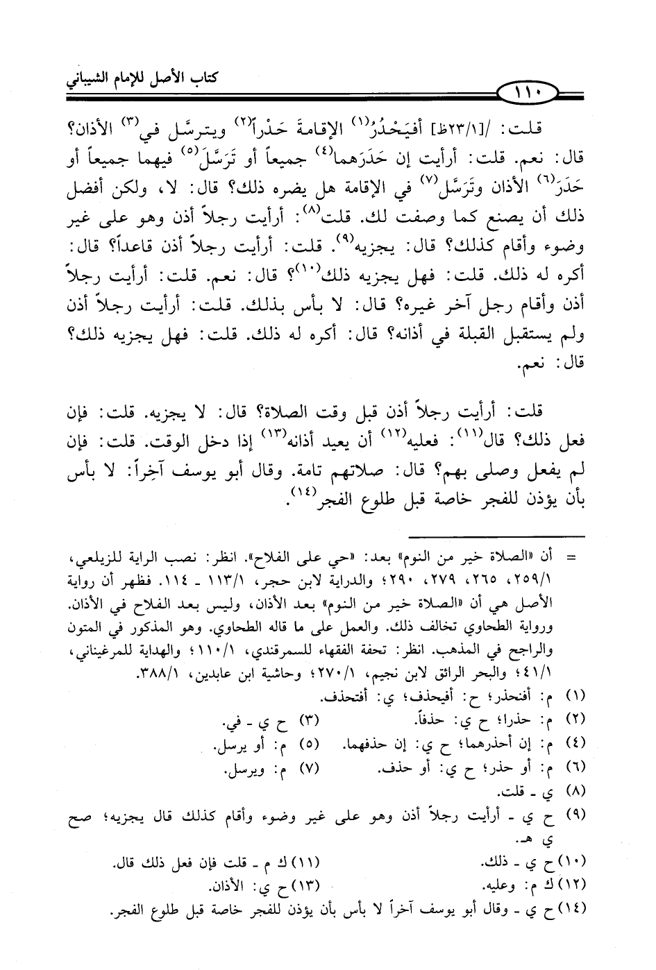 = أن "الصلاة خير من النوم" بعد: "حي على الفلاح". انظر: نصب الراية للزيلعي، 1/ 259، 265، 279، 290؛ والدراية لابن حجر، 1/ 113 - 114. فظهر أن رواية الأصل هي أن "الصلاة خير من النوم" بعد الأذان، وليس بعد الفلاح في الأذان. ورواية الطحاوي تخالف ذلك. والعمل على ما قاله الطحاوي. وهو المذكور في المتون والراجح في المذهب. انظر: تحفة الفقهاء للسمرقندي، 1/ 110؛ والهداية للمرغيناني، 1/ 41؛ والبحر الرائق لابن نجيم، 1/ 270؛ وحاشية ابن عابدين، 1/ 388.