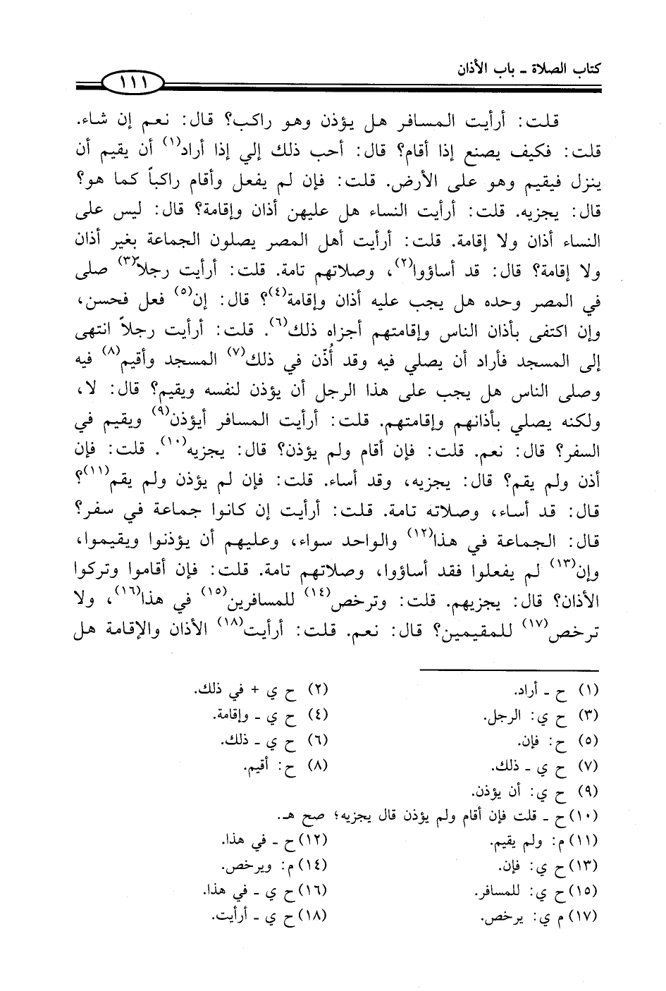 قلت: أرأيت المسافر هل يؤذن وهو راكب؟ قال: نعم إن شاء. قلت: فكيف يصنع إذا أقام؟ قال: أحب ذلك إلي إذا أراد (¬1) أن يقيم أن ينزل فيقيم وهو على الأرض. قلت: فإن لم يفعل وأقام راكباً كما هو؟ قال: يجزيه. قلت: أرأيت النساء هل عليهن أذان وإقامة؟ قال: ليس على النساء أذان ولا إقامة. قلت: أرأيت أهل المصر يصلون الجماعة بغير أذان ولا إقامة؟ قال: قد أساؤوا (¬2)، وصلاتهم تامة. قلت: أرأيت رجلاً (¬3) صلى في المصر وحده هل يجب عليه أذان وإقامة (¬4)؟ قال: إن (¬5) فعل فحسن، وإن اكتفى بأذان الناس وإقامتهم أجزاه ذلك (¬6). قلت: أرأيت رجلاً انتهى إلى المسجد فأراد أن يصلي فيه وقد أُذّن في ذلك (¬7) المسجد وأقيم (¬8) فيه وصلى الناس هل يجب على هذا الرجل أن يؤذن لنفسه ويقيم؟ قال: لا، ولكنه يصلي بأذانهم وإقامتهم. قلت: أرأيت المسافر أيؤذن (¬9) ويقيم في السفر؟ قال: نعم. قلت: فإن أقام ولم يؤذن؟ قال: يجزيه (¬10). قلت: فإن أذن ولم يقم؟ قال: يجزيه، وقد أساء. قلت: فإن لم يؤذن ولم يقم (¬11)؟ قال: قد أساء، وصلاته تامة. قلت: أرأيت إن كانوا جماعة في سفر؟ قال: الجماعة في هذا (¬12) والواحد سواء، وعليهم أن يؤذنوا ويقيموا، وإن (¬13) لم يفعلوا فقد أساؤوا، وصلاتهم تامة. قلت: فإن أقاموا وتركوا الأذان؟ قال: يجزيهم. قلت: وترخص (¬14) للمسافرين (¬15) في هذا (¬16)، ولا ترخص (¬17) للمقيمين؟ قال: نعم. قلت: أرأيت (¬18) الأذان والإقامة هل