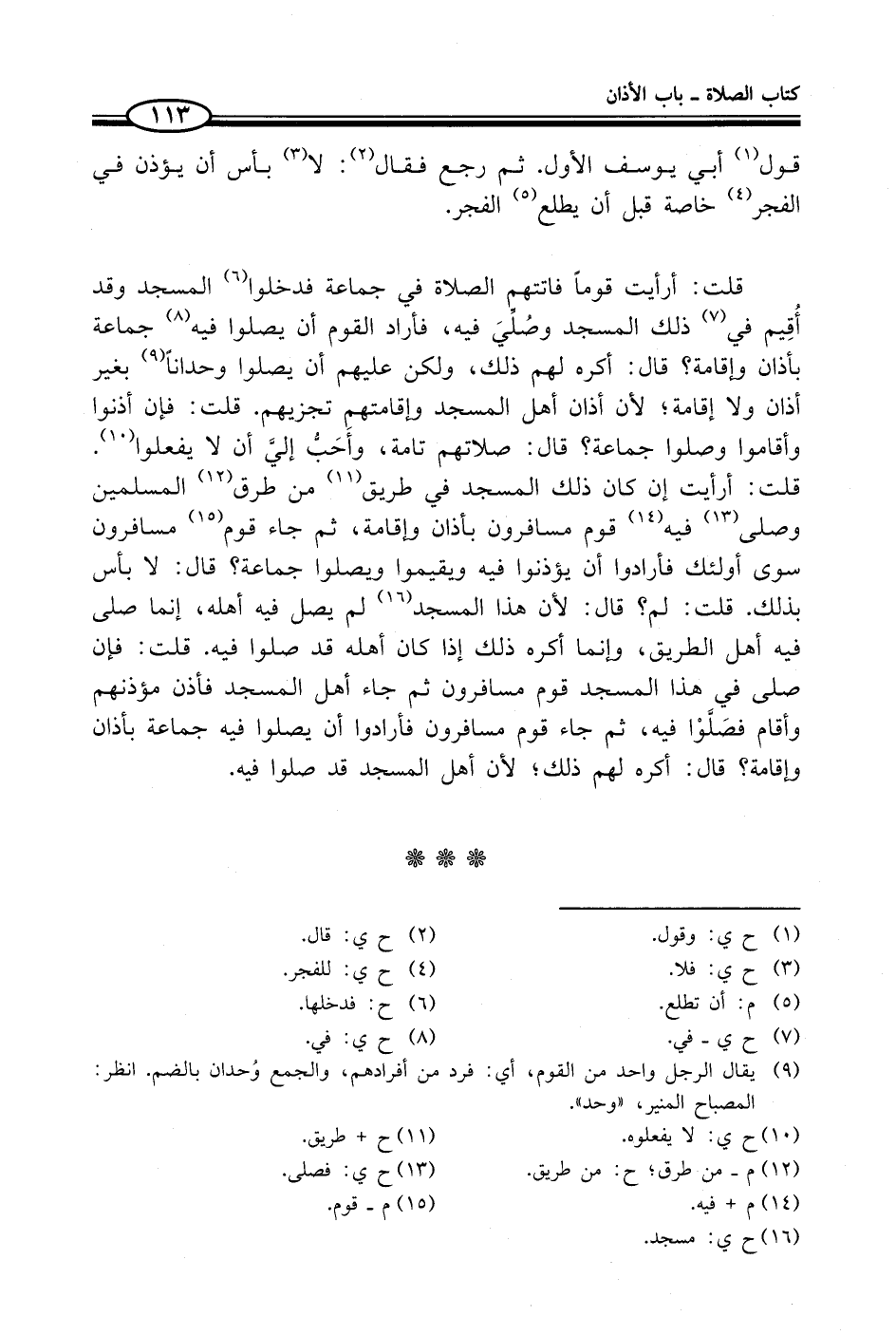 قلت: أرأيت قوماً فاتتهم الصلاة في جماعة فدخلوا (¬6) المسجد وقد أُقِيم في (¬7) ذلك المسجد وصُلِّيَ فيه، فأراد القوم أن يصلوا فيه (¬8) جماعة بأذان وإقامة؟ قال: أكره لهم ذلك، ولكن عليهم أن يصلوا وحداناً (¬9) بغير أذان ولا إقامة؛ لأن أذان أهل المسجد وإقامتهمِ تجزيهم. قلت: فإن أذنوا وأقاموا وصلوا جماعة؟ قال: صلاتهم تامة، وأحَبُّ إليَّ أن لا يفعلوا (¬10). قلت: أرأيت إن كان ذلك المسجد في طريق (¬11) من طرق (¬12) المسلمين وصلى (¬13) فيه (¬14) قوم مسافرون بأذان وإقامة، ثم جاء قوم (¬15) مسافرون سوى أولئك فأرادوا أن يؤذنوا فيه ويقيموا ويصلوا جماعة؟ قال: لا بأس بذلك. قلت: لم؟ قال: لأن هذا المسجد (¬16) لم يصل فيه أهله، إنما صلى فيه أهل الطريق، وإنما أكره ذلك إذا كان أهله قد صلوا فيه. قلت: فإن صلى في هذا المسجد قوم مسافرون ثم جاء أهل المسجد فأذن مؤذنهم وأقام فصَلَّوْا فيه، ثم جاء قوم مسافرون فأرادوا أن يصلوا فيه جماعة بأذان وإقامة؟ قال: أكره لهم ذلك؛ لأن أهل المسجد قد صلوا فيه.