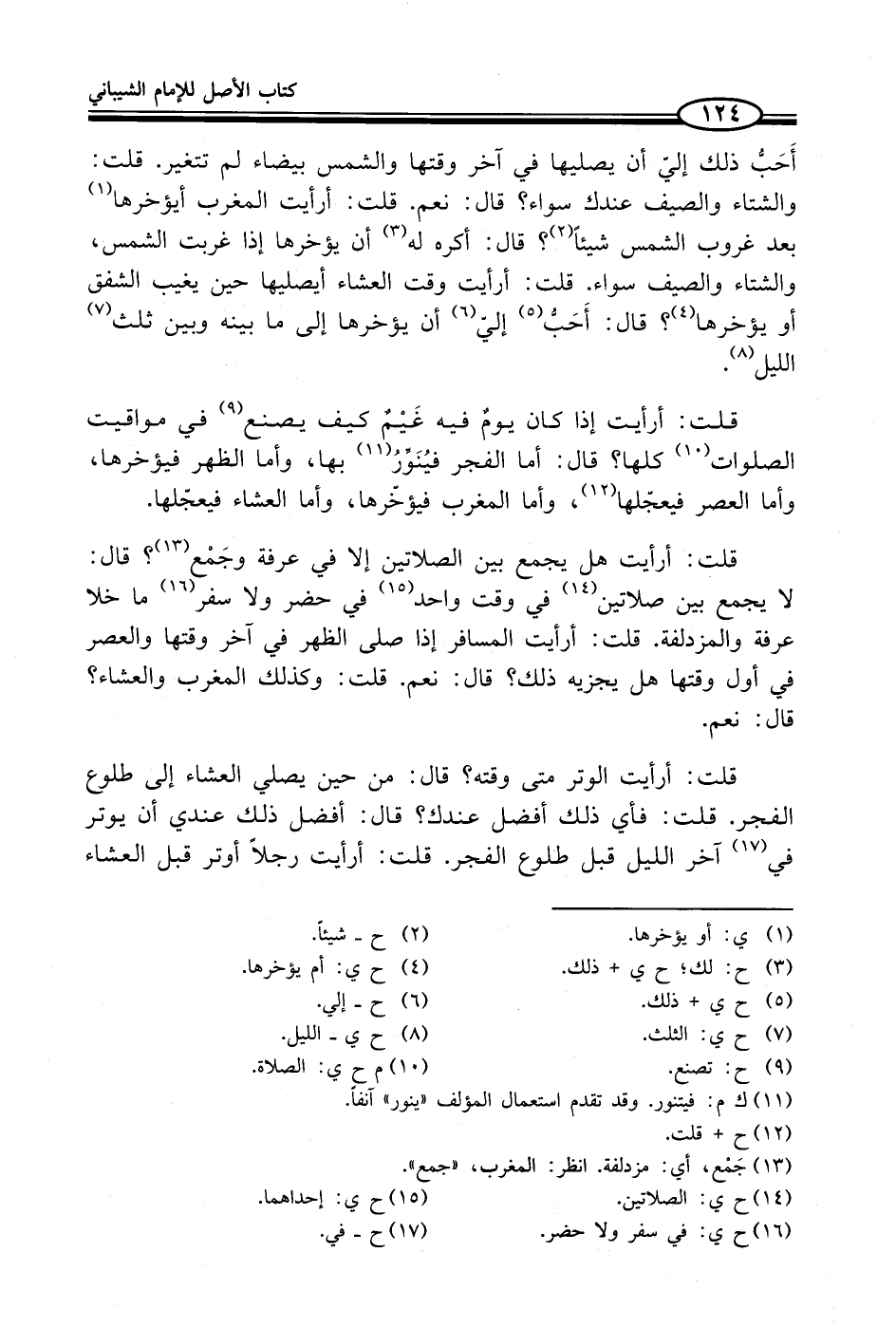 أَحَبُّ ذلك إليّ أن يصليها في آخر وقتها والشمس بيضاء لم تتغير. قلت: والشتاء والصيف عندك سواء؟ قال: نعم. قلت: أرأيت المغرب أيؤخرها (¬1) بعد غروب الشمس شيئاً (¬2)؟ قال: أكره له (¬3) أن يؤخرها إذا غربت الشمس، والشتاء والصيف سواء. قلت: أرأيت وقت العشاء أيصليها حين يغيب الشفق أو يؤخرها (¬4)؟ قال: أَحَبُّ (¬5) إليّ (¬6) أن يؤخرها إلى ما بينه وبين ثلث (¬7) الليل (¬8).