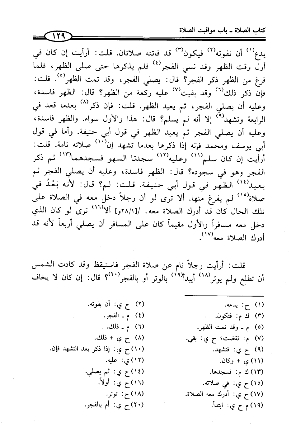قلت: أرأيت رجلاً نام عن صلاة الفجر فاستيقظ وقد كادت الشمس أن تطلع ولم يوتر (¬18) أيبدأ (¬19) بالوتر أو بالفجر (¬20)؟ قال: إن كان لا يخاف
