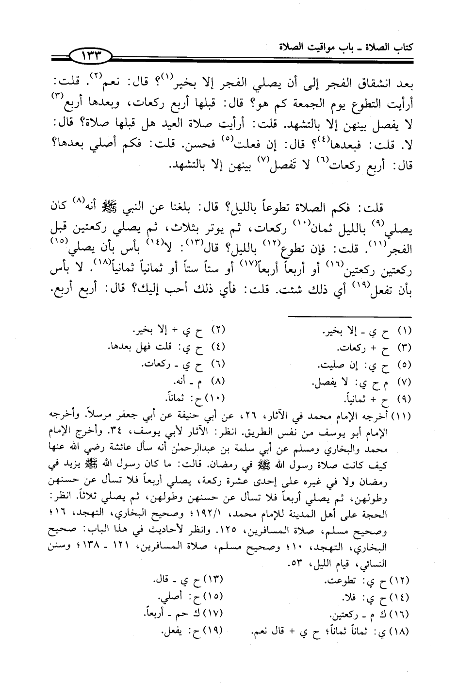 (¬11) أخرجه الإمام محمد في الآثار، 26، عن أبي حنيفة عن أبي جعفر مرسلاً. وأخرجه الإمام أبو يوسف من نفس الطريق. انظر: الآثار لأبي يوسف، 34. وأخرج الإمام محمد والبخاري ومسلم عن أبي سلمة بن عبد الرحمن أنه سأل عائشة - رضي الله عنها - كيف كانت صلاة رسول الله - صلى الله عليه وسلم - في رمضان. قالت: ما كان رسول الله - صلى الله عليه وسلم - يزيد في رمضان ولا في غيره على إحدى عشرة ركعة، يصلي أربعاً فلا تسأل عن حسنهن وطولهن، ثم يصلي أربعاً فلا تسأل عن حسنهن وطولهن، ثم يصلي ثلاثاً. انظر: الحجة على أهل المدينة للإمام محمد، 1/ 192؛ وصحيح البخاري، التهجد، 16؛ وصحيح مسلم، صلاة المسافرين، 125. وانظر لأحاديث في هذا الباب: صحيح البخاري، التهجد، 10؛ وصحيح مسلم، صلاة المسافرين، 121 - 138؛ وسنن النسائي، قيام الليل، 53.