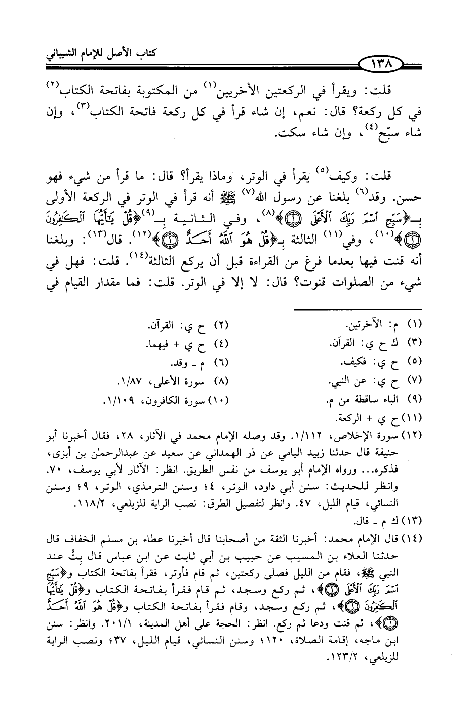 (¬14) قال الإمام محمد: أخبرنا الثقة من أصحابنا قال أخبرنا عطاء بن مسلم الخفاف قال حدثنا العلاء بن المسيب عن حبيب بن أبي ثابت عن ابن عباس قال بِتُّ عند النبي - صلى الله عليه وسلم -، فقام من الليل فصلى ركعتين، ثم قام فأوتر، فقرأ بفاتحة الكتاب و {سَبِّحِ اسْمَ رَبِّكَ الْأَعْلَى (1)}، ثم ركع وسجد، ثم قام فقرأ بفاتحة الكتاب و {قُلْ يَاأَيُّهَا الْكَافِرُونَ (1)}، ثم ركع وسجد، وقام فقرأ بفاتحة الكتاب و {قُلْ هُوَ اللَّهُ أَحَدٌ (1)}، ثم قنت ودعا ثم ركع. انظر: الحجة على أهل المدينة، 1/ 201. وانظر: سنن ابن ماجه، إقامة الصلاة، 120؛ وسنن النسائي، قيام الليل، 37؛ ونصب الراية للزيلعي، 2/ 123.