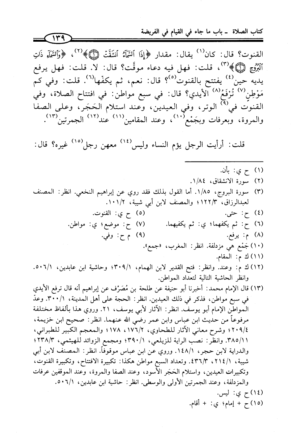 (¬13) قال الإمام محمد: أخبرنا أبو حنيفة عن طلحة بن مُصَرِّف عن إبراهيم أنه قال ترفع الأيدي في سبع مواطن، فذكر في ذلك العيدين. انظر: الحجة على أهل المدينة، 1/ 300. وعدّ المواطن الإمام أبو يوسف. انظر: الآثار لأبي يوسف، 21. وروي هذا بألفاظ مختلفة مرفوعًا من حديث ابن عباس وابن عمر - رضي الله عنهما -. انظر: صحيح ابن خزيمة، 4/ 209؛ وشرح معاني الآثار للطحاوي، 2/ 176، 178؛ والمعجم الكبير للطبراني، 11/ 385. وانظر: نصب الراية للزيلعي، 1/ 390؛ ومجمع الزوائد للهيثمي، 3/ 238؛ والدراية لابن حجر، 1/ 148. وروي عن ابن عباس موقوفاً. انظر: المصنف لابن أبي شيبة، 1/ 214، 3/ 436. وتعداد السبع مواطن هكذا: تكبيرة الافتتاح، وتكبيرة القنوت، وتكبيرات العيدين، واستلام الحَجَر الأسود، وعند الصفا والمروة، وعند الموقفين عرفات والمزدلفة، وعند الجمرتين الأولى والوسطى. انظر: حاشية ابن عابدين، 1/ 506.