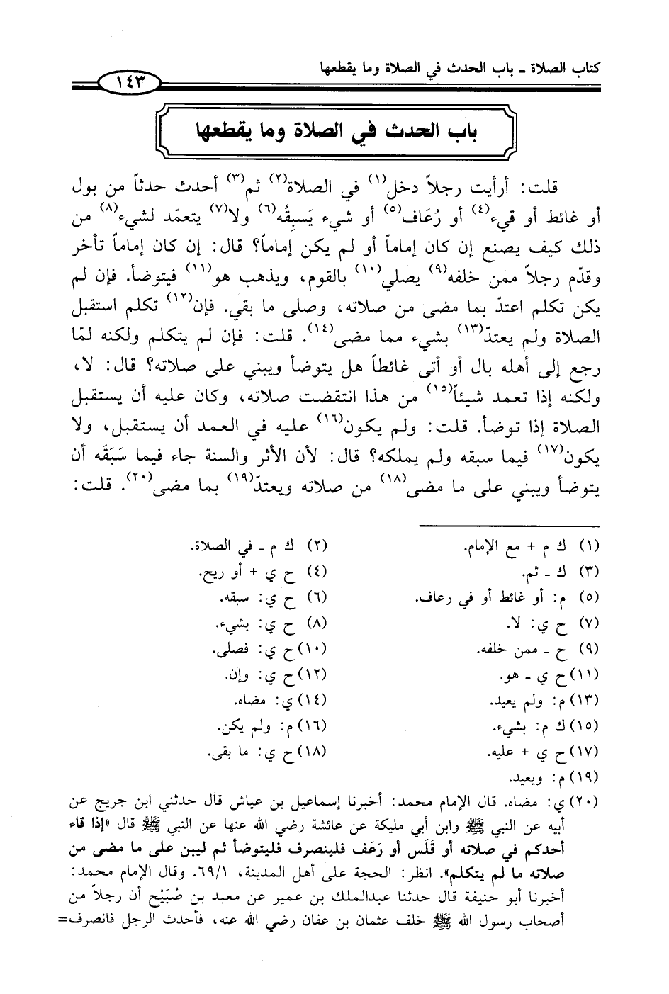 (¬20) ي: مضاه. قال الإمام محمد: أخبرنا إسماعيل بن عياش قال حدثني ابن جريج عن أبيه عن النبي - صلى الله عليه وسلم - وابن أبي مليكة عن عائشة - رضي الله عنها - عن النبي - صلى الله عليه وسلم - قال "إذا قاء أحدكم في صلاته أو قَلَس أو رَعَف فلينصرف فليتوضأ ثم ليبن على ما مضى من صلاته ما لم يتكلم". انظر: الحجة على أهل المدينة، 1/ 69. وقال الإمام محمد: أخبرنا أبو حنيفة قال حدثنا عبدالملك بن عمير عن معبد بن صُبَيْح أن رجلاً من أصحاب رسول الله - صلى الله عليه وسلم - خلف عثمان بن عفان - رضي الله عنه -، فأحدث الرجل فانصرف =