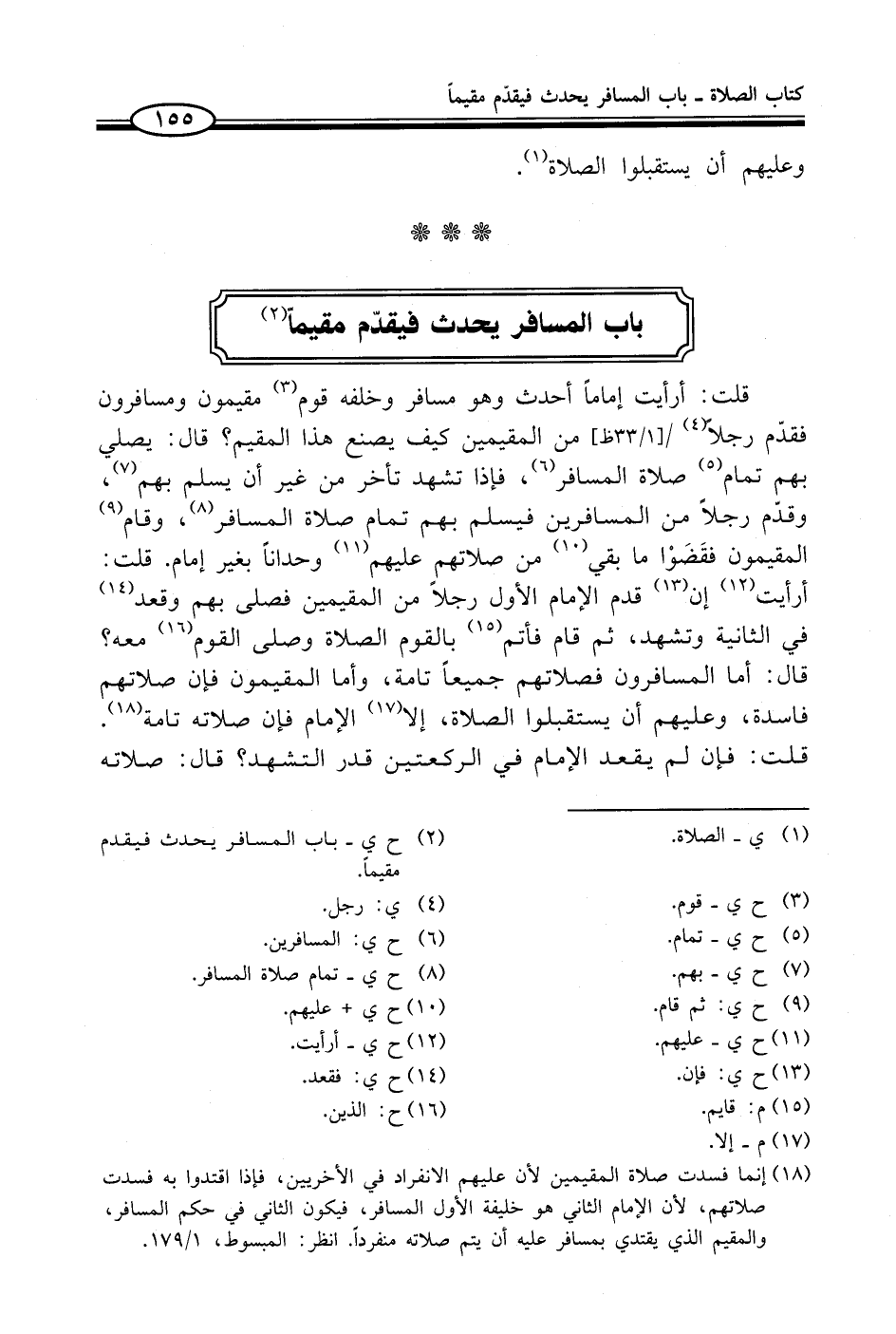 (¬18) إنما فسدت صلاة المقيمين لأن عليهم الانفراد في الأخريين، فإذا اقتدوا به فسدت صلاتهم، لأن الإمام الثاني هو خليفة الأول المسافر، فيكون الثاني في حكم المسافر، والمقيم الذي يقتدي بمسافر عليه أن يتم صلاته منفرداً. انظر: المبسوط، 1/ 179.