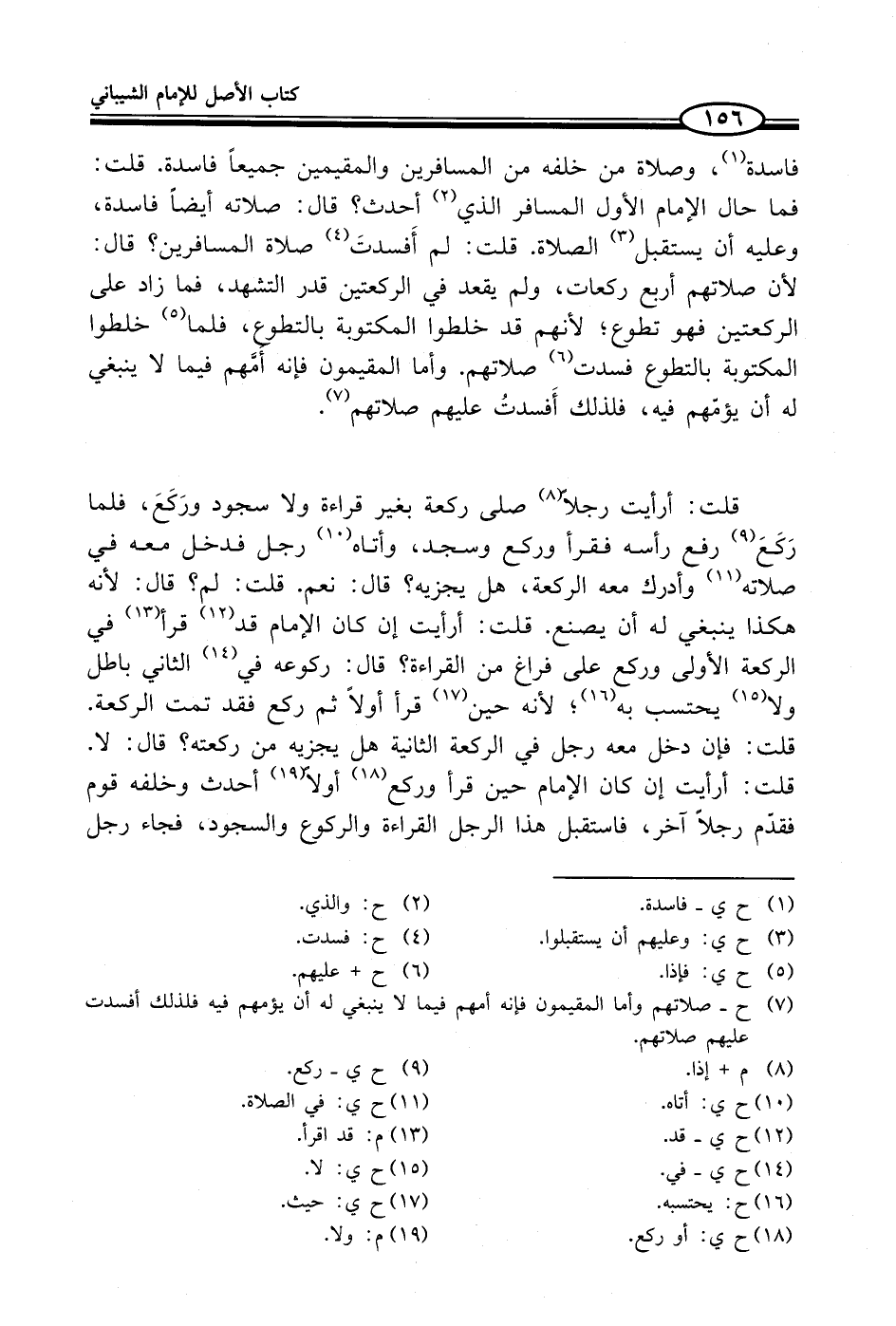 فاسدة (¬1)، وصلاة من خلفه من المسافرين والمقيمين جميعاً فاسدة. قلت: فما حال الإمام الأول المسافر الذي (¬2) أحدث؟ قال: صلاته أيضاً فاسدة، وعليه أن يستقبل (¬3) الصلاة. قلت: لم أَفسدتَ (¬4) صلاة المسافرين؟ قال: لأن صلاتهم أربع ركعات، ولم يقعد في الركعتين قدر التشهد، فما زاد على الركعتين فهو تطوع؛ لأنهم قد خلطوا المكتوبة بالتطوع، فلما (¬5) خلطوا المكتوبة بالتطوع فسدت (¬6) صلاتهم. وأما المقيمون فإنه أمَّهم فيما لا ينبغي له أن يؤمّهم فيه، فلذلك أَفسدت عليهم صلاتهم (¬7).