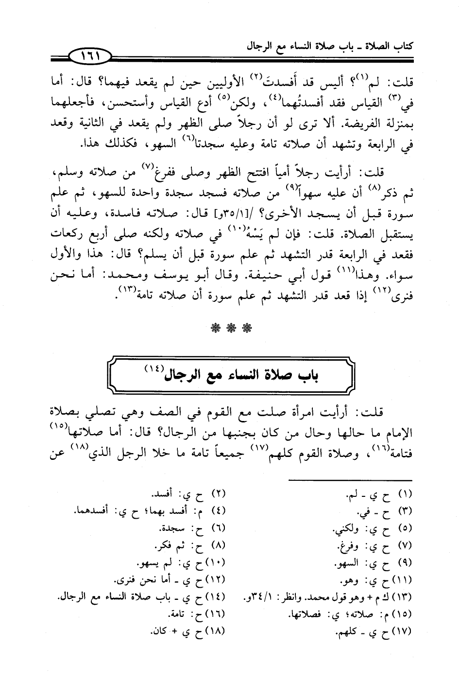 قلت: أرأيت امرأة صلت مع القوم في الصف وهي تصلي بصلاة الإمام ما حالها وحال من كان بجنبها من الرجال؟ قال: أما صلاتها (¬15) فتامة (¬16)، وصلاة القوم كلهم (¬17) جميعاً تامة ما خلا الرجل الذي (¬18) عن
