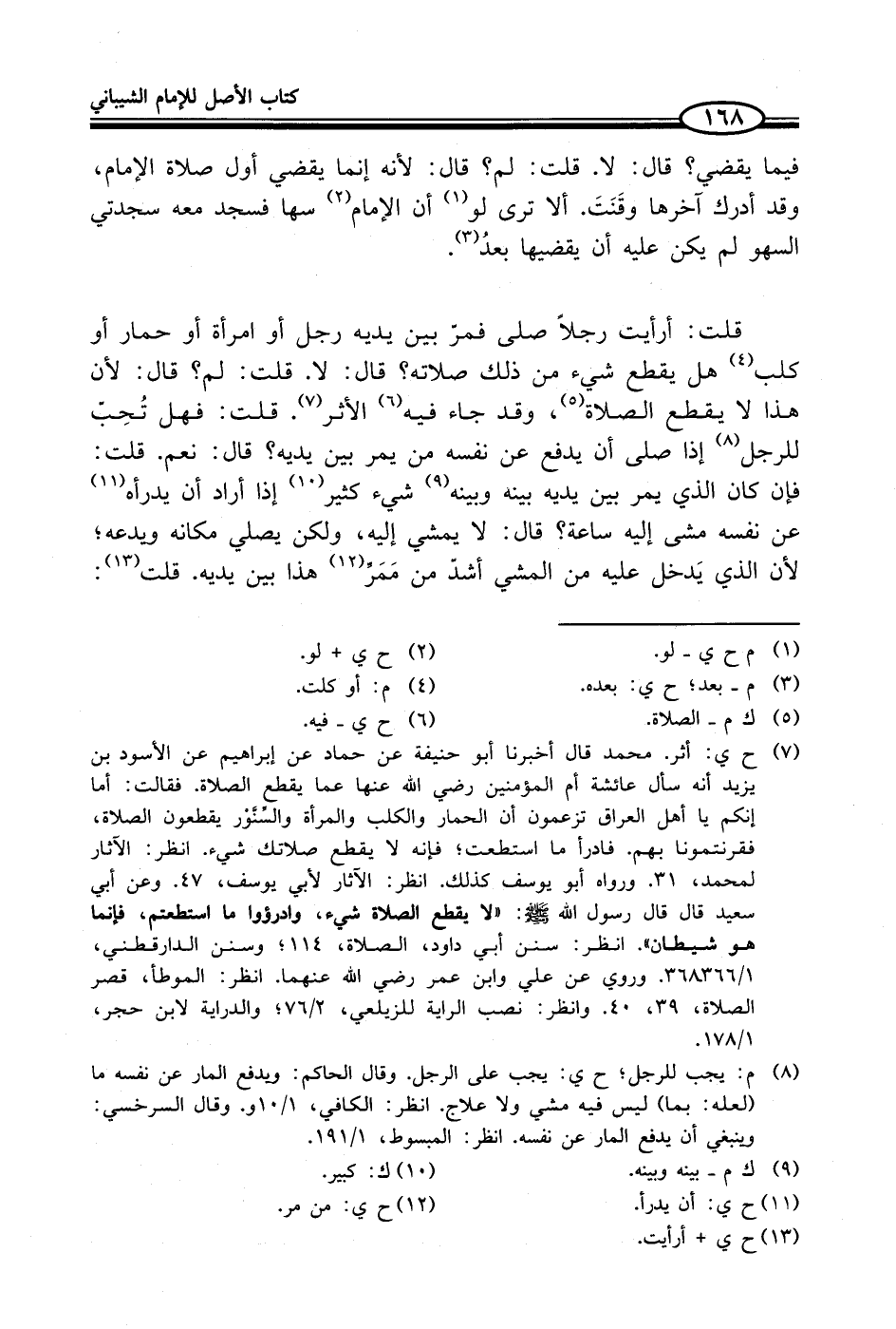 (¬7) ح ي: أثر. محمد قال أخبرنا أبو حنيفة عن حماد عن إبراهيم عن الأسود بن يزيد أنه سأل عائشة أم المؤمنين - رضي الله عنها- عما يقطع الصلاة. فقالت: أما إنكم يا أهل العراق تزعمون أن الحمار والكلب والمرأة والسِّنَّوْر يقطعون الصلاة، فقرنتمونا بهم. فادرأ ما استطعت؛ فإنه لا يقطع صلاتك شيء. انظر: الآثار لمحمد، 31. ورواه أبو يوسف كذلك. انظر: الآثار لأبي يوسف، 47. وعن أبي سعيد قال قال رسول الله - صلى الله عليه وسلم -: "لا يقطع الصلاة شيء، وادرؤوا ما استطعتم، فإنما هو شيطان". انظر: سنن أبي داود، الصلاة، 114؛ وسنن الدارقطني، 1/ 366 - 368. وروي عن علىِ وابن عمر - رضي الله عنهما-. انظر: الموطأ، قصر الصلاة، 39. 40. وانظر: نصب الراية للزيلعي، 2/ 76؛ والدراية لابن حجر، 1/ 178.