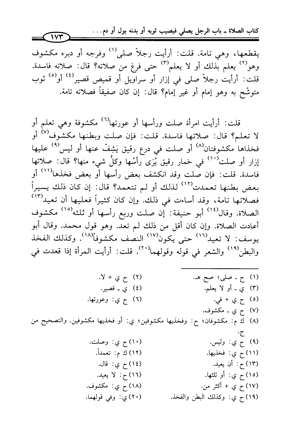 يقطعها، وهي تامة. قلت: أرأيت رجلاً صلى (¬1) وفرجه أو دبره مكشوف وهو (¬2) يعلم بذلك أو لا يعلم (¬3) حتى فرغ من صلاته؟ قال: صلاته فاسدة. قلت: أرأيت رجلاً صلى في إزار أو سراويل أو قميص قصير (¬4) أو (¬5) ثوب متوشّح به وهو إمام أو غير إمام؟ قال: إن كان صفيقاً فصلاته تامة.