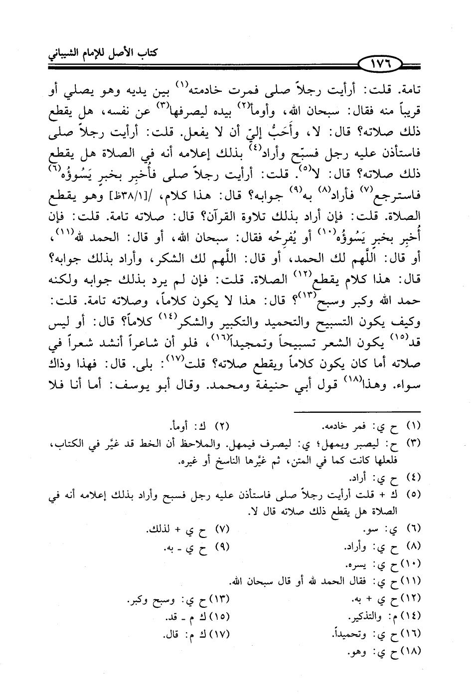 تامة. قلت: أرأيت رجلاً صلى فمرت خادمته (¬1) بين يديه وهو يصلي أو قريباً منه فقال: سبحان الله، وأومأ (¬2) بيده ليصرفها (¬3) عن نفسه، هل يقطع ذلك صلاته؟ قال: لا، وأَحَبُّ إليّ أن لا يفعل. قلت: أرأيت رجلاً صلى فاستأذن عليه رجل فسبّح وأراد (¬4) بذلك إعلامه أنه في الصلاة هل يقطع ذلك صلاته؟ قال: لا (¬5). قلت: أرأيت رجلاً صلى فأُخبِر بخبرٍ يَسُوؤُه (¬6) فاسترجع (¬7) فأراد (¬8) به (¬9) جوابه؟ قال: هذا كلام، وهو يقطع الصلاة. قلت: فإن أراد بذلك تلاوة القرآن؟ قال: صلاته تامة. قلت: فإن أُخبِر بخبرٍ يَسُوؤُه (¬10) أو يُفرِحُه فقال: سبحان الله، أو قال: الحمد لله (¬11)، أو قال: اللَّهم لك الحمد، أو قال: اللَّهم لك الشكر، وأراد بذلك جوابه؟ قال: هذا كلام يقطع (¬12) الصلاة. قلت: فإن لم يرد بذلك جوابه ولكنه حمد الله وكبر وسبح (¬13)؟ قال: هذا لا يكون كلاماً، وصلاته تامة. قلت: وكيف يكون التسبيح والتحميد والتكبير والشكر (¬14) كلاماً؟ قال: أو ليس قد (¬15) يكون الشعر تسبيحاً وتمجيداً (¬16)، فلو أن شاعراً أنشد شعراً في صلاته أما كان يكون كلاماً ويقطع صلاته؟ قلت (¬17): بلى. قال: فهذا وذاك سواء. وهذا (¬18) قول أبي حنيفة ومحمد. وقال أبو يوسف: أما أنا فلا