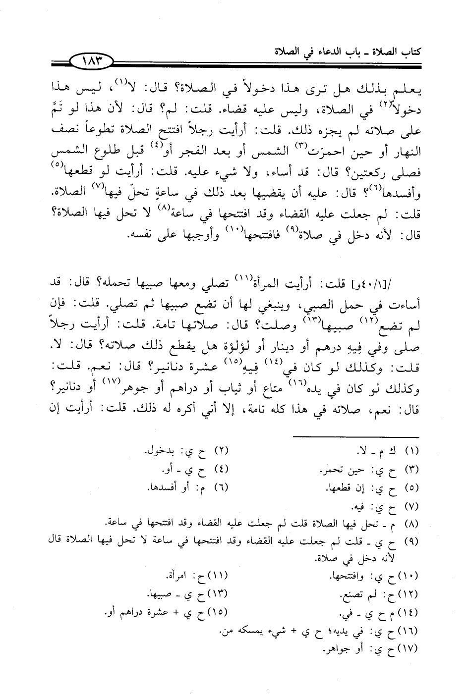 قلت: أرأيت المرأة (¬11) تصلي ومعها صبيها تحمله؟ قال: قد أساءت في حمل الصبي، وينبغي لها أن تضع صبيها ثم تصلي. قلت: فإن لم تضع (¬12) صبيها (¬13) وصلت؟ قال: صلاتها تامة. قلت: أرأيت رجلاً صلى وفي فِيهِ درهم أو دينار أو لؤلؤة هل يقطع ذلك صلاته؟ قال: لا. قلت: وكذلك لو كان في (¬14) فِيهِ (¬15) عشرة دنانير؟ قال: نعم. قلت: وكذلك لو كان في يده (¬16) متاع أو ثياب أو دراهم أو جوهر (¬17) أو دنانير؟ قال: نعم، صلاته في هذا كله تامة، إلا أني أكره له ذلك. قلت: أرأيت إن