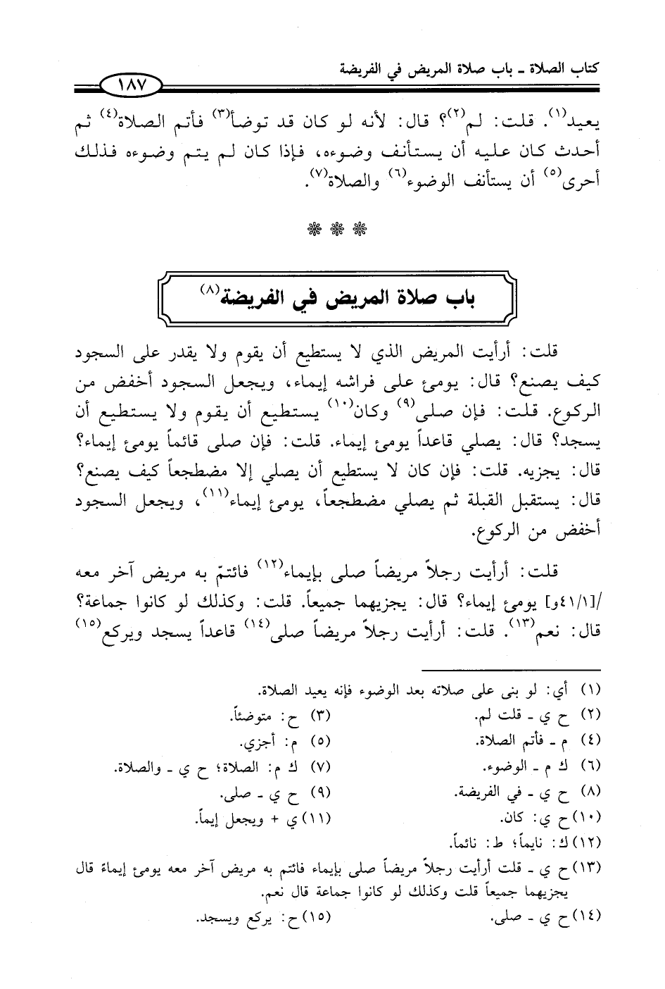 (¬13) ح ي - قلت أرأيت رجلاً مريضاً صلى بإيماء فائتم به مريض آخر معه يومئ إيماءً قال يجزيهما جميعاً قلت وكذلك لو كانوا جماعة قال نعم.
