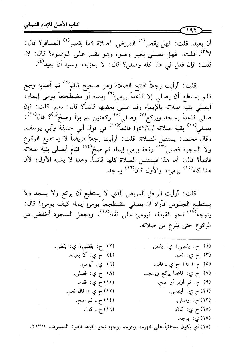 (¬18) أي يكون مستلقياً على ظهره، ويتوجه بوجهه نحو القبلة. انظر: المبسوط، 1/ 213.
