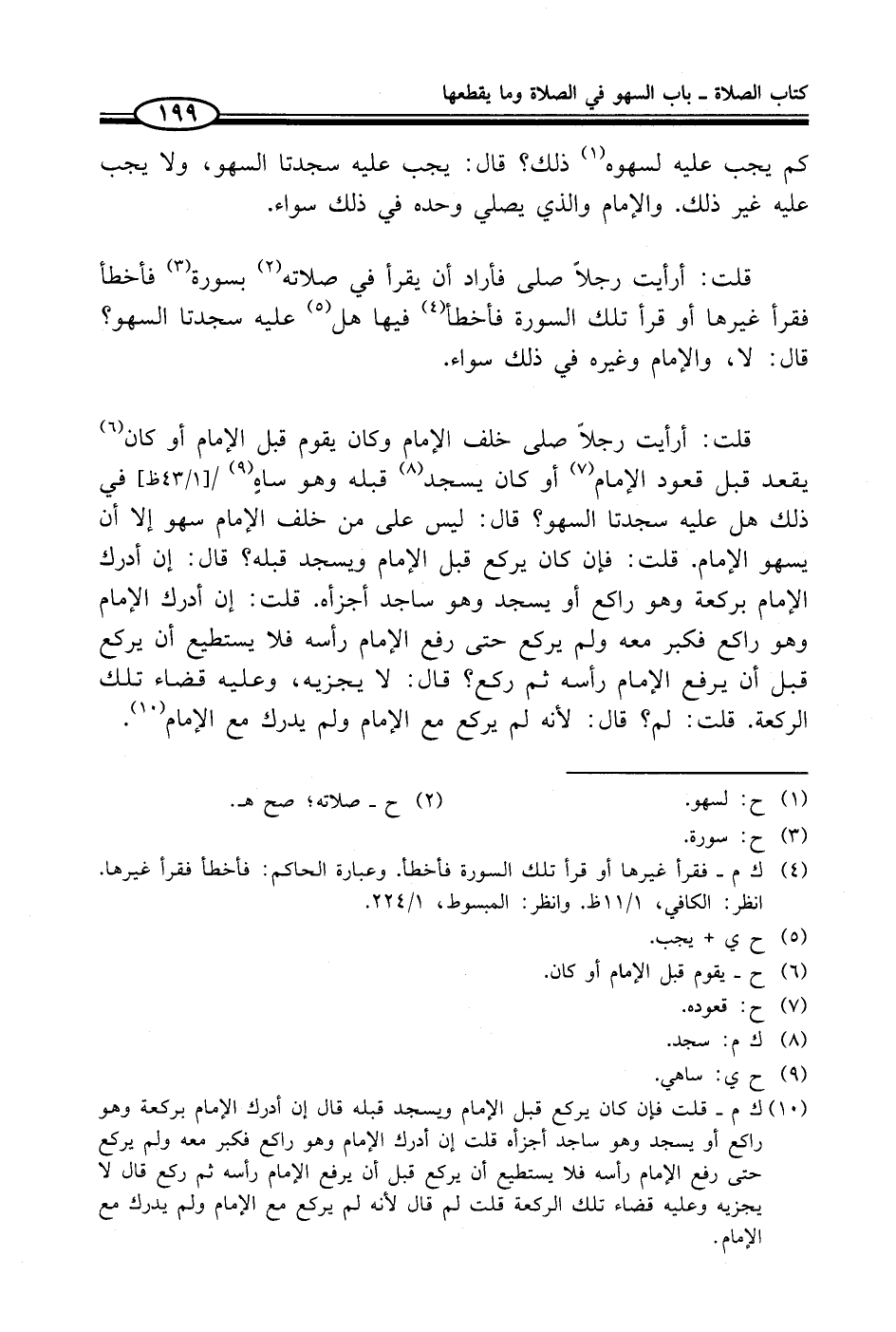 (¬4) ك م - فقرأ غيرها أو قرأ تلك السورة فأخطأ. وعبارة الحاكم: فأخطأ فقرأ غيرها. انظر: الكافي، 1/ 11 ظ. وانظر: المبسوط، 1/ 224.