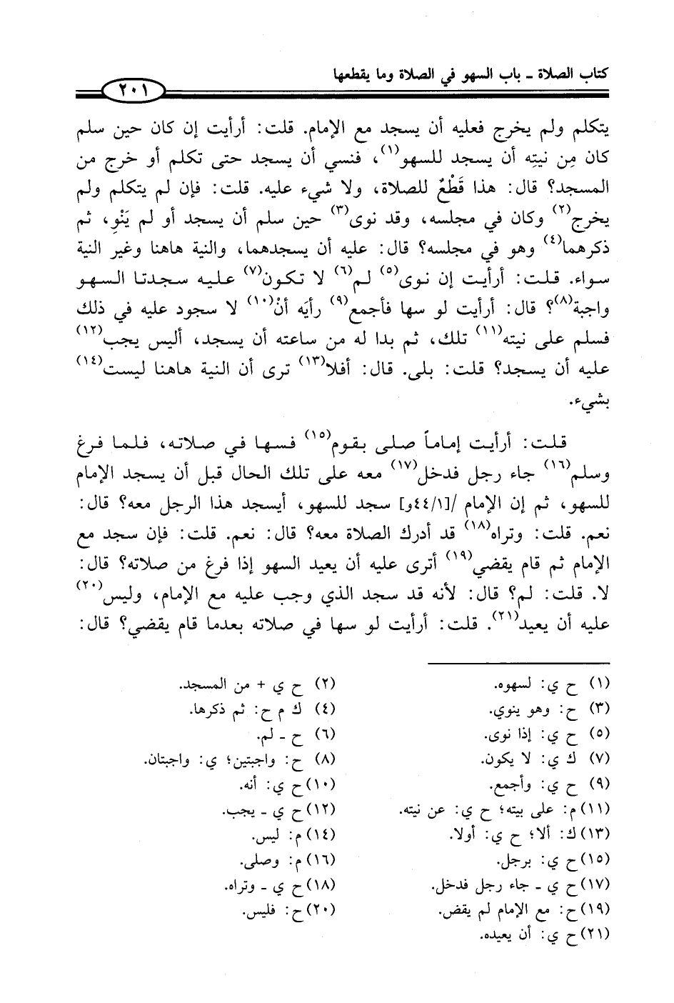 يتكلم ولم يخرج فعليه أن يسجد مع الإمام. قلت: أرأيت إن كان حين سلم كان مِن نيتِه أن يسجد للسهو (¬1)، فنسي أن يسجد حتى تكلم أو خرج من المسجد؟ قال: هذا قَطْعٌ للصلاة، ولا شيء عليه. قلت: فإن لم يتكلم ولم يخرج (¬2) وكان في مجلسه، وقد نوى (¬3) حين سلم أن يسجد أو لم يَنْوِ، ثم ذكرهما (¬4) وهو في مجلسه؟ قال: عليه أن يسجدهما، والنية هاهنا وغير النية سواء. قلت: أرأيت إن نوى (¬5) لم (¬6) لا تكون (¬7) عليه سجدتا السهو واجبة (¬8)؟ قال: أرأيت لو سها فأجمع (¬9) رأيَه أنْ (¬10) لا سجود عليه في ذلك فسلم على نيته (¬11) تلك، ثم بدا له من ساعته أن يسجد، أليس يجب (¬12) عليه أن يسجد؟ قلت: بلى. قال: أفلا (¬13) ترى أن النية هاهنا ليست (¬14) بشيء.