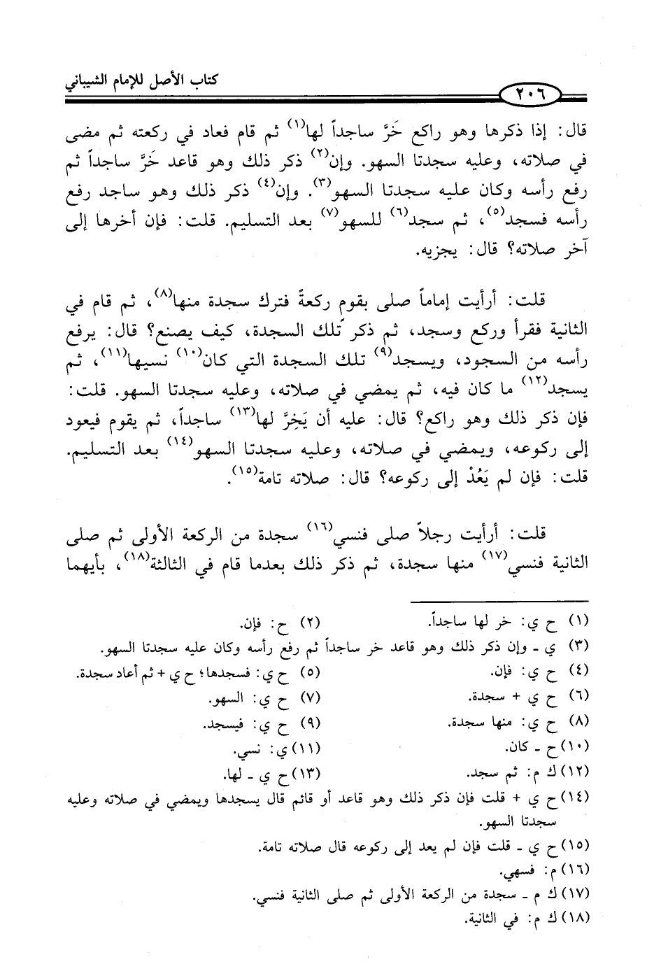 قلت: أرأيت إماماً صلى بقوم ركعةً فترك سجدة منها (¬8)، ثم قام في الثانية فقرأ وركع وسجد، ثم ذكر تلك السجدة، كيف يصنع؟ قال: يرفع رأسه من السجود، ويسجد (¬9) تلك السجدة التي كان (¬10) نسيها (¬11)، ثم يسجد (¬12) ما كان فيه، ثم يمضي في صلاته، وعليه سجدتا السهو. قلت: فإن ذكر ذلك وهو راكع؟ قال: عليه أن يَخِرَّ لها (¬13) ساجداً، ثم يقوم فيعود إلى ركوعه، ويمضي في صلاته، وعليه سجدتا السهو (¬14) بعد التسليم. قلت: فإن لم يَعُدْ إلى ركوعه؟ قال: صلاته تامة (¬15).