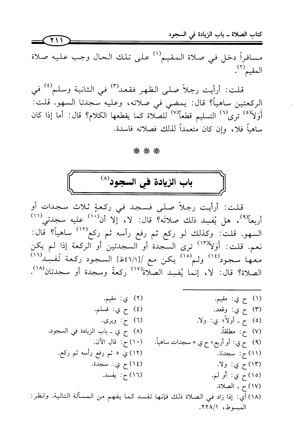 (¬18) أي: إذا زاد في الصلاة ذلك فإنها تفسد كما يفهم من المسألة التالية. وانظر: المبسوط، 1/ 228.