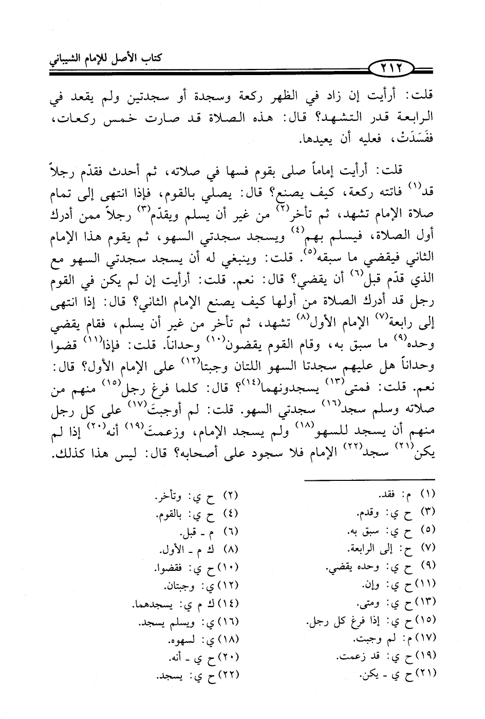 قلت: أرأيت إماماً صلى بقوم فسها في صلاته، ثم أحدث فقدّم رجلاً قد (¬1) فاتته ركعة، كيف يصنع؟ قال: يصلي بالقوم، فإذا انتهى إلى تمام صلاة الإمام تشهد، ثم تأخر (¬2) من غير أن يسلم ويقدّم (¬3) رجلاً ممن أدرك أول الصلاة، فيسلم بهم (¬4) ويسجد سجدتي السهو، ثم يقوم هذا الإمام الثاني فيقضي ما سبقه (¬5). قلت: وينبغي له أن يسجد سجدتي السهو مع الذي قدّم قبل (¬6) أن يقضي؟ قال: نعم. قلت: أرأيت إن لم يكن في القوم رجل قد أدرك الصلاة من أولها كيف يصنع الإمام الثاني؟ قال: إذا انتهى إلى رابعة (¬7) الإمام الأول (¬8) تشهد، ثم تأخر من غير أن يسلم، فقام يقضي وحده (¬9) ما سبق به، وقام القوم يقضون (¬10) وحداناً. قلت: فإذا (¬11) قضوا وحداناً هل عليهم سجدتا السهو اللتان وجبتا (¬12) على الإمام الأول؟ قال: نعم. قلت: فمتى (¬13) يسجدونهما (¬14)؟ قال: كلما فرغ رجل (¬15) منهم من صلاته وسلم سجد (¬16) سجدتي السهو. قلت: لم أوجبتَ (¬17) على كل رجل منهم أن يسجد للسهو (¬18) ولم يسجد الإمام، وزعمتَ (¬19) أنه (¬20) إذا لم يكن (¬21) سجد (¬22) الإمام فلا سجود على أصحابه؟ قال: ليس هذا كذلك.
