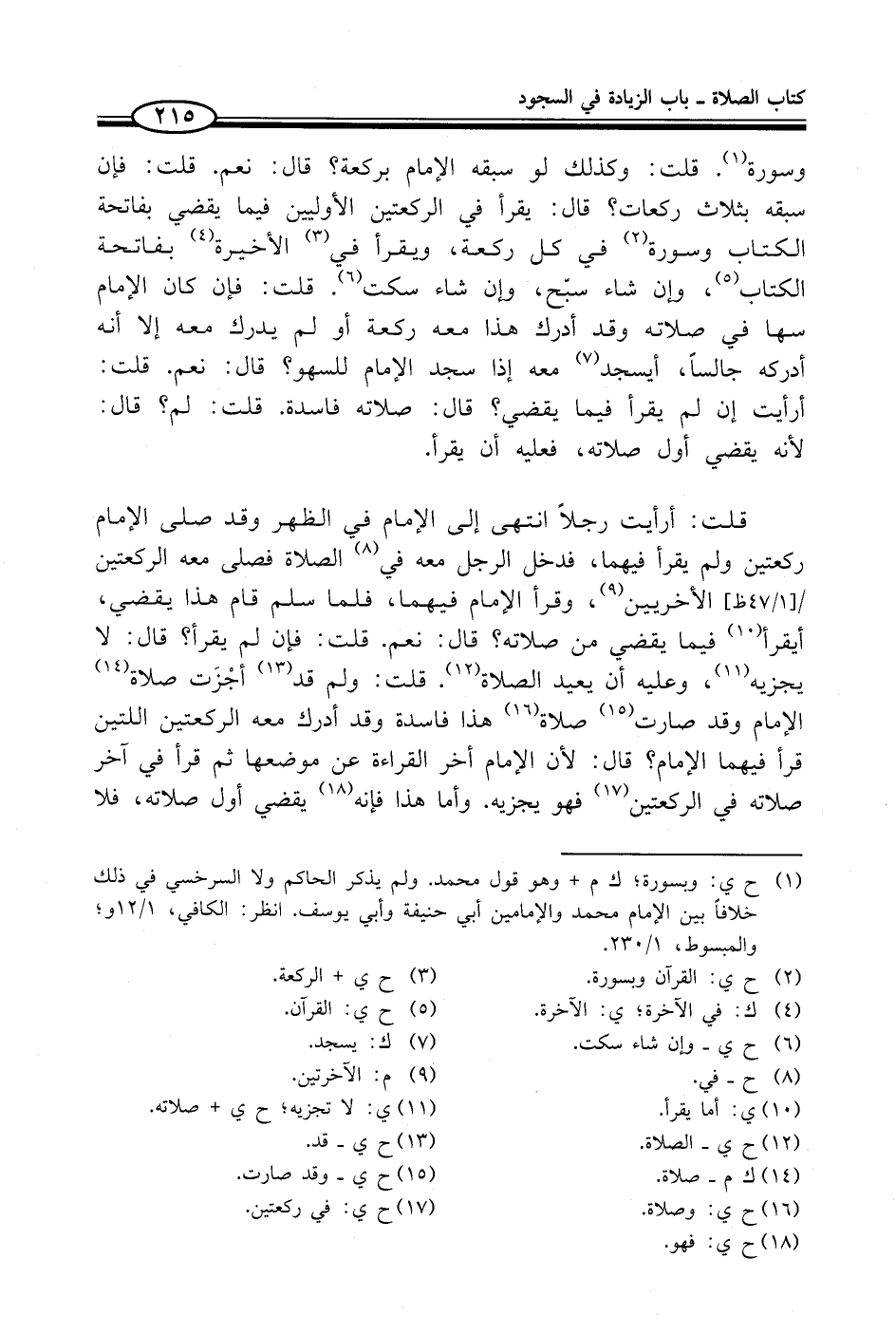 وسورة (¬1). قلت: وكذلك لو سبقه الإمام بركعة؟ قال: نعم. قلت: فإن سبقه بثلاث ركعات؟ قال: يقرأ في الركعتين الأوليين فيما يقضي بفاتحة الكتاب وسورة (¬2) في كل ركعة، ويقرأ في (¬3) الأخيرة (¬4) بفاتحة الكتاب (¬5)، وإن شاء سبّح، وإن شاء سكت (¬6). قلت: فإن كان الإمام سها في صلاته وقد أدرك هذا معه ركعة أو لم يدرك معه إلا أنه أدركه جالساً، أيسجد (¬7) معه إذا سجد الإمام للسهو؟ قال: نعم. قلت: أرأيت إن لم يقرأ فيما يقضي؟ قال: صلاته فاسدة. قلت: لم؟ قال: لأنه يقضي أول صلاته، فعليه أن يقرأ.