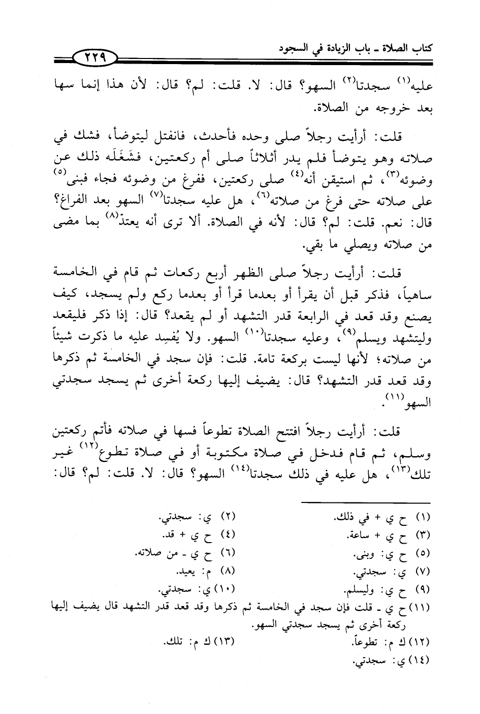قلت: أرأيت رجلاً صلى الظهر أربع ركعات ثم قام في الخامسة ساهياً، فذكر قبل أن يقرأ أو بعدما قرأ أو بعدما ركع ولم يسجد، كيف يصنع وقد قعد في الرابعة قدر التشهد أو لم يقعد؟ قال: إذا ذكر فليقعد وليتشهد ويسلم (¬9)، وعليه سجدتا (¬10) السهو. ولا يُفسِد عليه ما ذكرت شيئاً من صلاته؛ لأنها ليست بركعة تامة. قلت: فإن سجد في الخامسة ثم ذكرها وقد قعد قدر التشهد؟ قال: يضيف إليها ركعة أخرى ثم يسجد سجدتي السهو (¬11).