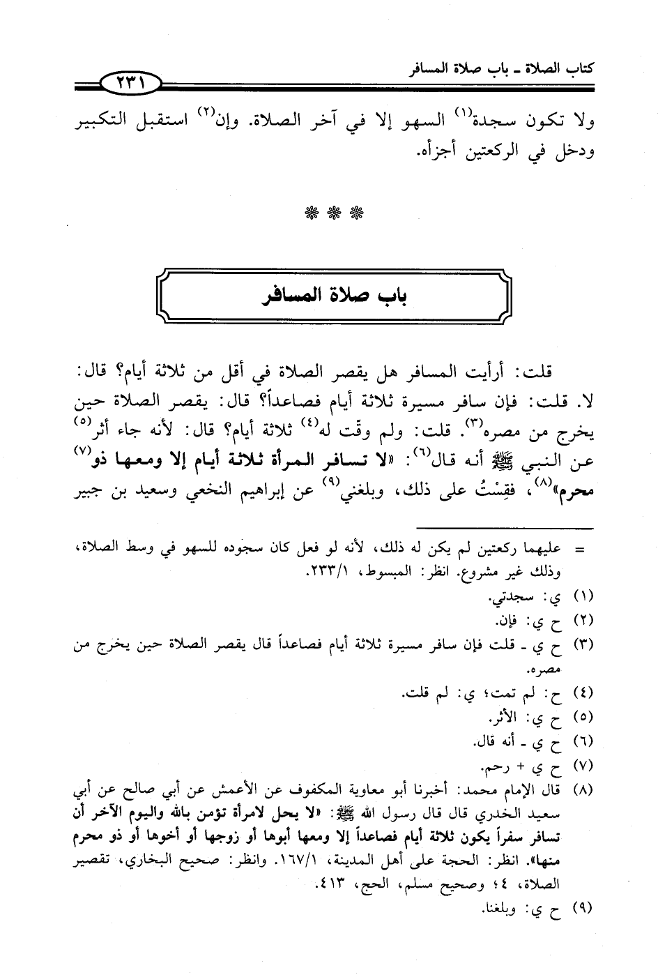 (¬8) قال الإمام محمد: أخبرنا أبو معاوية المكفوف عن الأعمش عن أبي صالح عن أبي سعيد الخدري قال قال رسول الله - صلى الله عليه وسلم -: "لا يحل لامرأة تؤمن بالله واليوم الآخر أن تسافر سفراً يكون ثلائة أيام فصاعداً إلا ومعها أبوها أو زوجها أو أخوها أو ذو محرم منها". انظر: الحجة على أهل المدينة، 1/ 167. وانظر: صحيح البخاري، تقصير الصلاة، 4؛ وصحيح مسلم، الحج، 413.