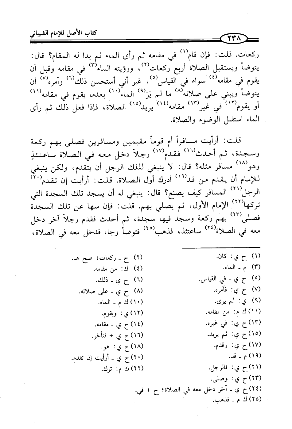 ركعات. قلت: فإن قام (¬1) في مقامه ثم رأى الماء ثم بدا له المقام؟ قال: يتوضأ ويستقبل الصلاة أربع ركعات (¬2)، ورؤيته الماء (¬3) في مقامه وقبل أن يقوم في مقامه (¬4) سواء في القياس (¬5)، غير أني أستحسن ذلك (¬6) وآمره (¬7) أن يتوضأ ويبني على صلاته (¬8) ما لم يَرَ (¬9) الماء (¬10) بعدما يقوم في مقامه (¬11) أو يقوم (¬12) في غير (¬13) مقامه (¬14) يريد (¬15) الصلاة، فإذا فعل ذلك ثم رأى الماء استقبل الوضوء والصلاة.
