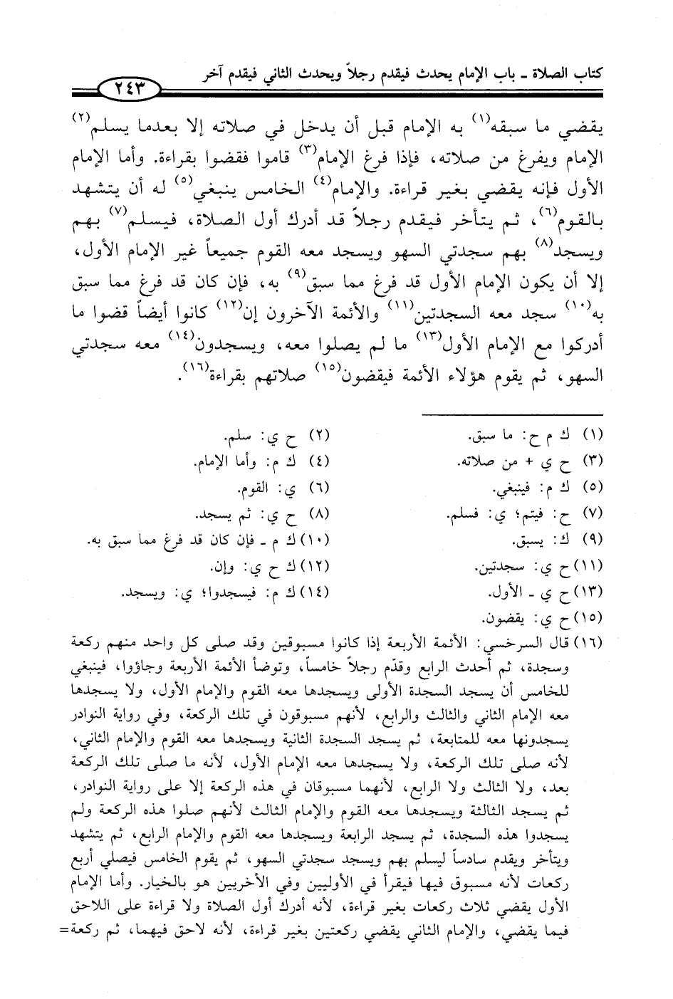 (¬16) قال السرخسي: الأئمة الأربعة إذا كانوا مسبوقين وقد صلى كل واحد منهم ركعة وسجدة، ثم أحدث الرابع وقدّم رجلاً خامساً، وتوضأ الأئمة الأربعة وجاؤوا، فينبغي للخامس أن يسجد السجدة الأولى ويسجدها معه القوم والإمام الأول، ولا يسجدها معه الإمام الثاني والثالث والرابع، لأنهم مسبوقون في تلك الركعة، وفي رواية النوادر يسجدونها معه للمتابعة، ثم يسجد السجدة الثانية ويسجدها معه القوم والإمام الثاني، لأنه صلى تلك الركعة، ولا يسجدها معه الإمام الأول، لأنه ما صلى تلك الركعة بعد، ولا الثالث ولا الرابع، لأنهما مسبوقان في هذه الركعة إلا على رواية النوادر، ثم يسجد الثالثة ويسجدها معه القوم والإمام الثالث لأنهم صلوا هذه الركعة ولم يسجدوا هذه السجدة، ثم يسجد الرابعة ويسجدها معه القوم والإمام الرابع، ثم يتشهد ويتأخر ويقدم سادسًا ليسلم بهم ويسجد سجدتي السهو، ثم يقوم الخامس فيصلي أربع ركعات لأنه مسبوق فيها فيقرأ في الأوليين وفي الأخريين هو بالخيار. وأما الإمام الأول يقضي ثلاث ركعات بغير قراءة، لأنه أدرك أول الصلاة ولا قراءة على اللاحق فيما يقضي، والإمام الثاني يقضي ركعتين بغير قراءة، لأنه لاحق فيهما، ثم ركعة=