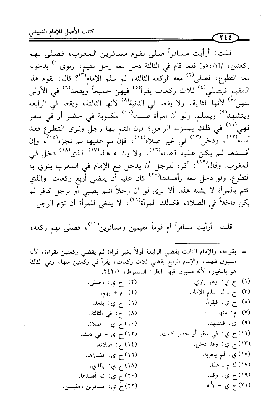 قلت: أرأيت مسافراً صلى بقوم مسافرين المغرب، فصلى بهم ركعتين، فلما قام في الثالثة دخل معه رجل مقيم، ونوى (¬1) بدخوله معه التطوع، فصلى (¬2) معه الركعة الثالثة، ثم سلم الإمام (¬3)؟ قال: يقوم هذا المقيم فيصلي (¬4) ثلاث ركعات يقرأ (¬5) فيهن جميعاً ويقعد (¬6) في الأولى منهن (¬7) لأنها الثانية، ولا يقعد في الثانية (¬8) لأنها الثالثة، ويقعد في الرابعة ويتشهد (¬9) ويسلم. ولو أن امرأة صلت (¬10) مكتوبة في حضر أو في سفر فهي (¬11) في ذلك بمنزلة الرجل؛ فإن ائتم بها رجل ونوى التطوع فقد أساء (¬12)، ودخل (¬13) في غير صلاة (¬14)، فإن تم عليها لم تجزه (¬15)، وإن أفسدها لم يكن عليه قضاء (¬16)، ولا يشبه هذا (¬17) الذي (¬18) دخل في المغرب. وقال (¬19): أكره للرجل أن يدخل مع الإمام في المغرب ينوي به التطوع. ولو دخل معه وأفسدها (¬20) كان عليه أن يقضي أربع ركعات. والذي ائتم بالمرأة لا يشبه هذا. ألا ترى لو أن رجلاً ائتم بصبي أو برجل كافر لم يكن داخلاً في الصلاة، فكذلك المرأة (¬21)، لا ينبغي للمرأة أن تؤم الرجل.