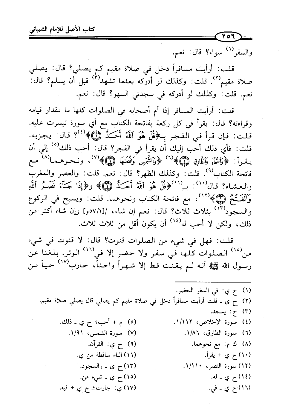قلت: أرأيت المسافر إذا أم أصحابه في الصلوات كلها ما مقدار قيامه وقراءته؟ قال: يقرأ في كل ركعة بفاتحة الكتاب مع أي سورة تيسرت عليه. قلت: فإن قرأ في الفجر بـ {قُلْ هُوَ اللَّهُ أَحَدٌ (1)} (¬4)؟ قال: يجزيه. قلت: فأي ذلك أحب إليك أَن يقرأ في الفجر؟ قال: أحب ذلك (¬5) إلي أن يقرأ: {وَالسَّمَاءِ وَالطَّارِقِ (1)} (¬6) {وَالشَّمْسِ وَضُحَاهَا (1)} (¬7)، ونحوهما (¬8) مع فاتحة الكتاب (¬9). قلت: وكذلك الظهر؟ قال: نعم. قلت: والعصر والمغرب والعشاء؟ قال (¬10): بِـ (¬11) {قُلْ هُوَ اللَّهُ أَحَدٌ (1)} و {إِذَا جَاءَ نَصْرُ اللَّهِ وَالْفَتْحُ (1)} (¬12)، مع فاتحة الكتاب ونحوهما. قلت: ويسبح في الركوع والسجود (¬13) بثلاث ثلاث؟ قال: نعم إن شاء، وإن شاء أكثر من ذلك، ولكن لا أحب له (¬14) أن يكون أقل من ثلاث ثلاث.